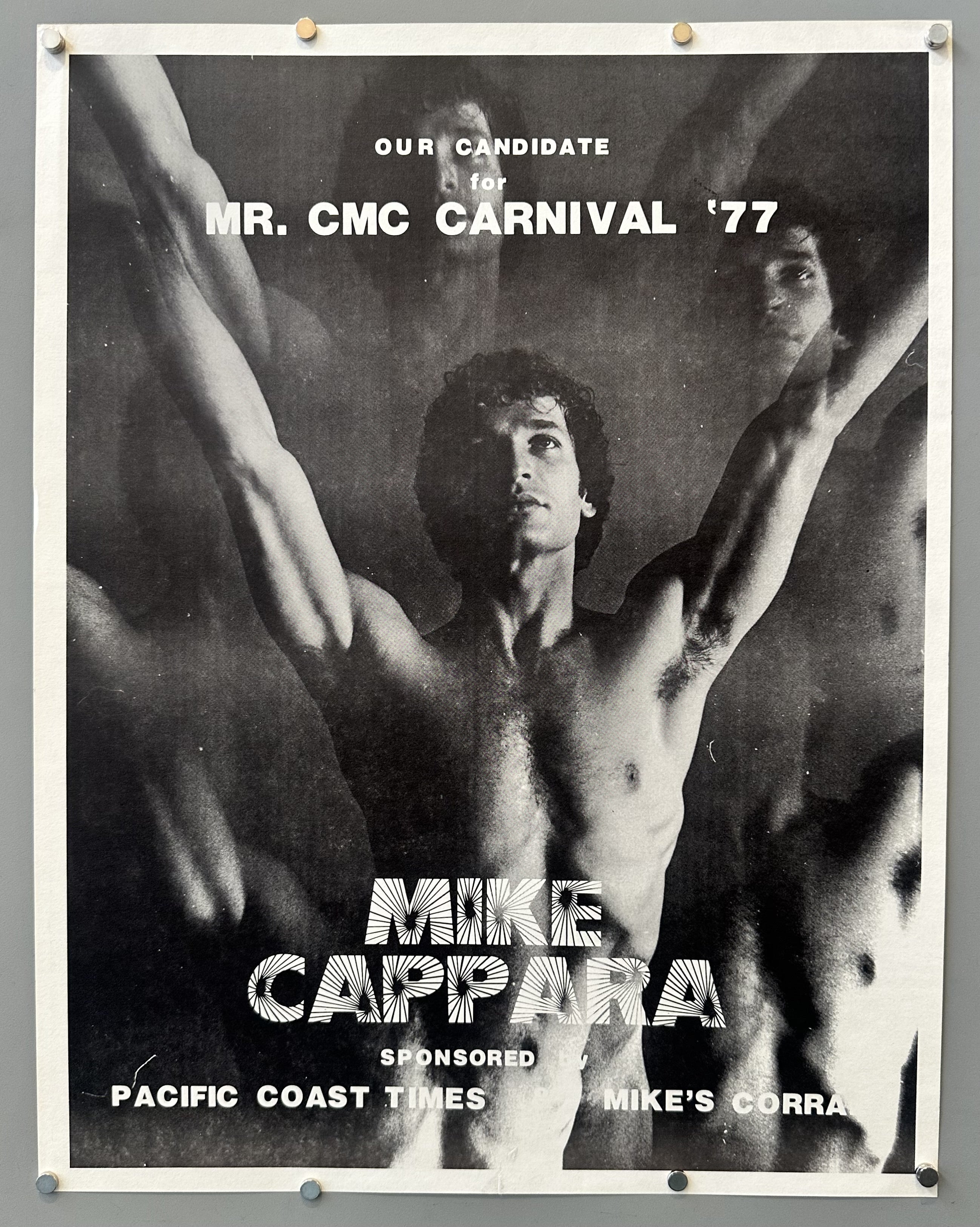 This campaign poster is for Michael Cappara's candidacy for Mr. CMC Carnival '77, sponsored by the Pacific Coast Times and Mike's Corra. Michael Cappara was a professional ballet dancer, choreographer, and teacher. He began dancing at age five and received scholarships to leading dance academies, including the American Ballet Theatre School in NYC.