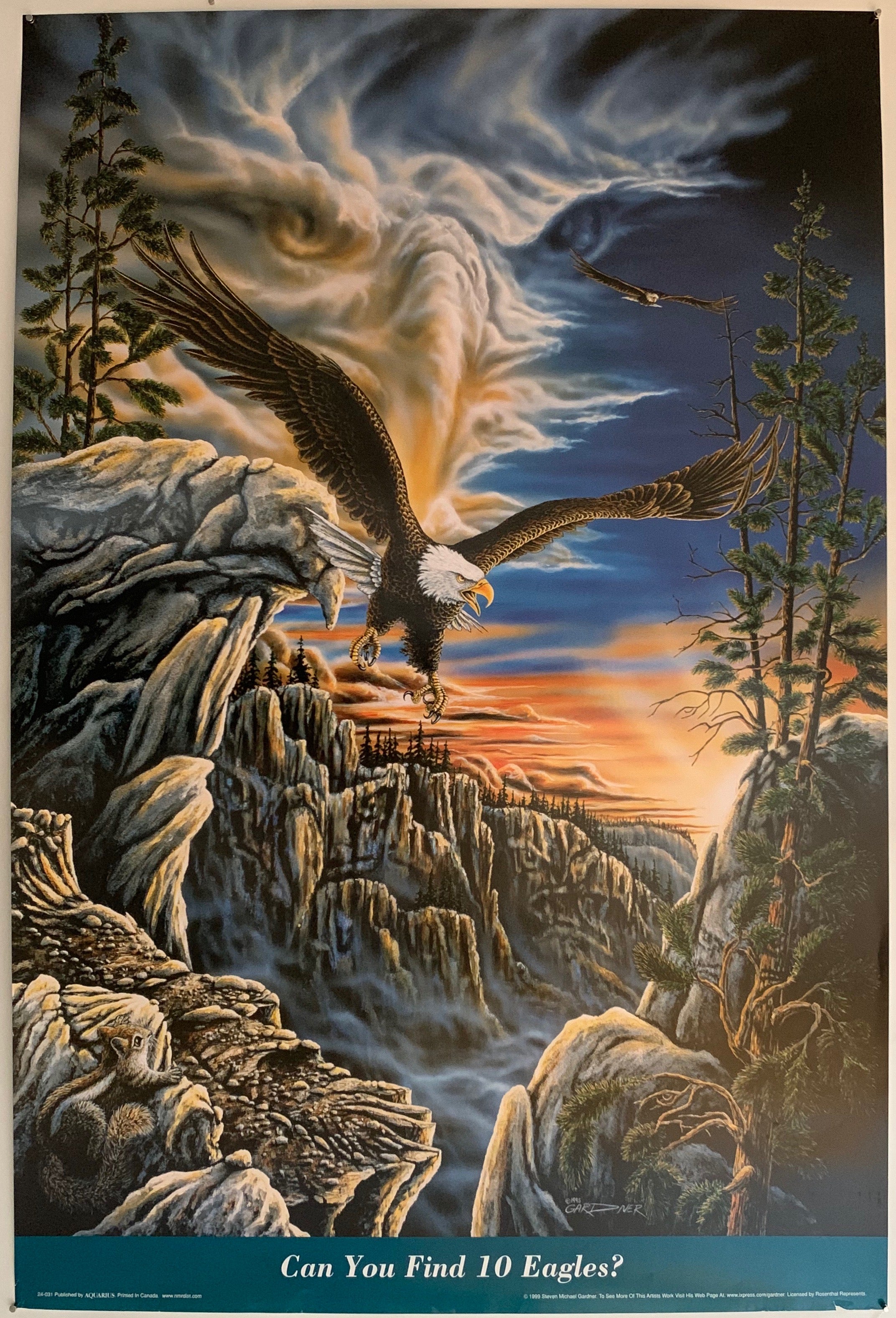 A lovely nature poster featuring multiple bald-headed eagles, some flying in the air, others hidden in the rockface and clouds.