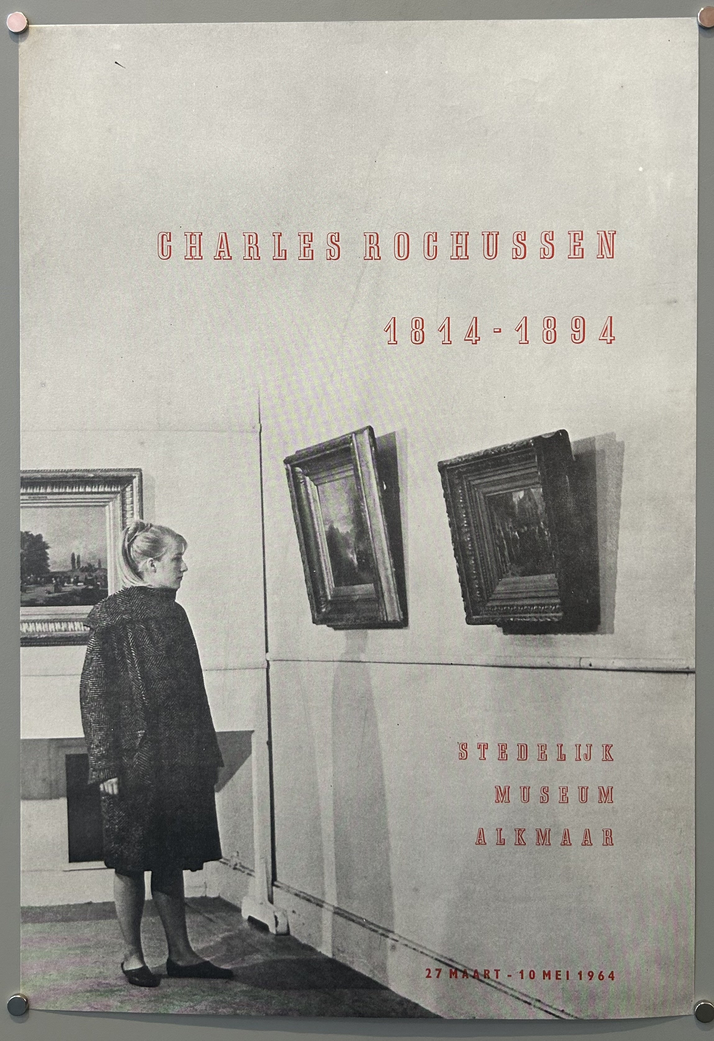 Retrospective on Dutch painter, illustrator, and printmaker, featured at the Stedelijk Museum. This black and white photograph shows a woman contemplating Rochussen's paintings.