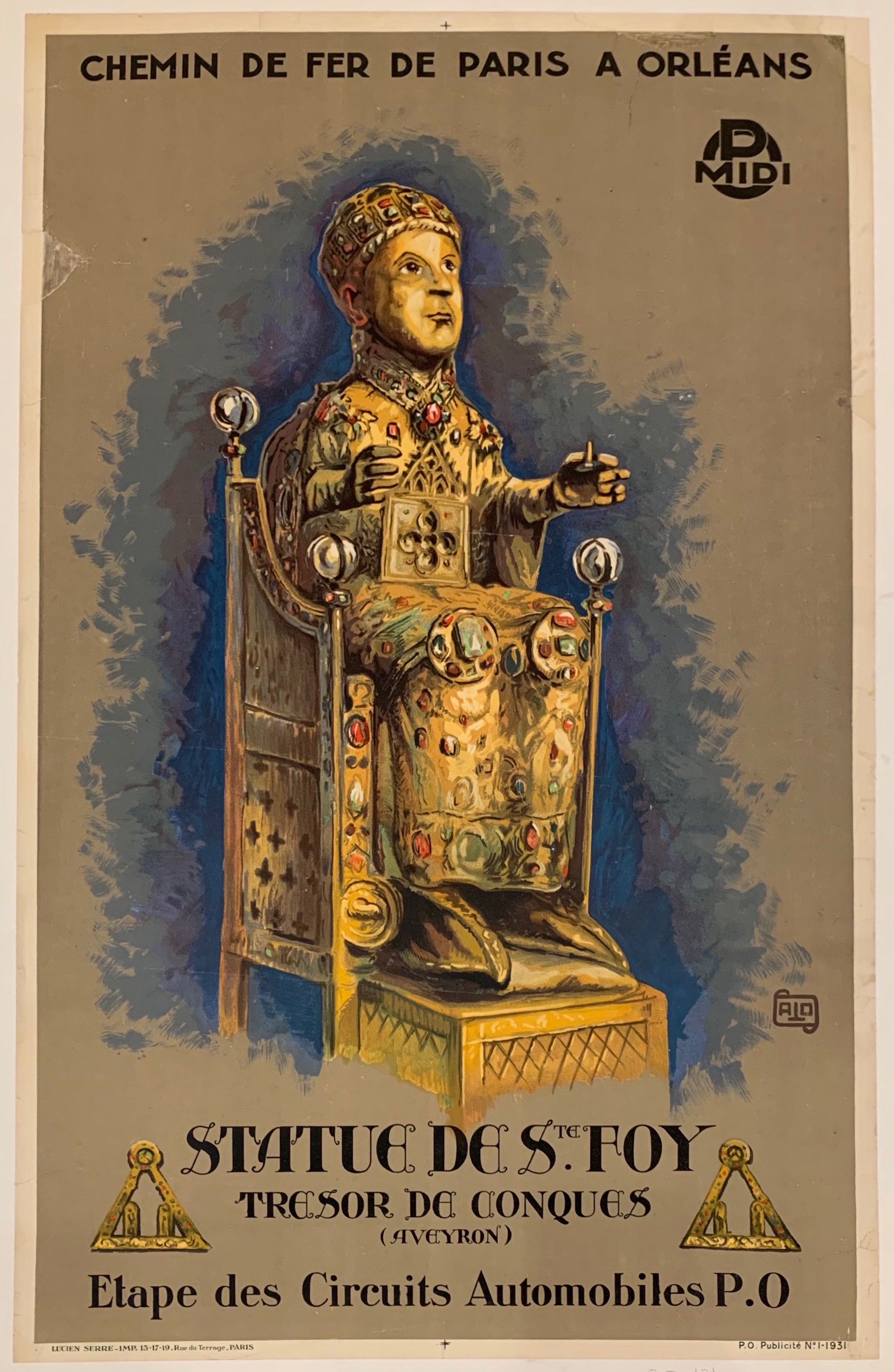 This beautiful original poster shows a famous reliquary, a golden statue enclosing the skull of Saint Foy. Located in Conques, France, people flock to see this sculpture, both for religious reasons and to marvel at the jewels, golden wood, and general structure.