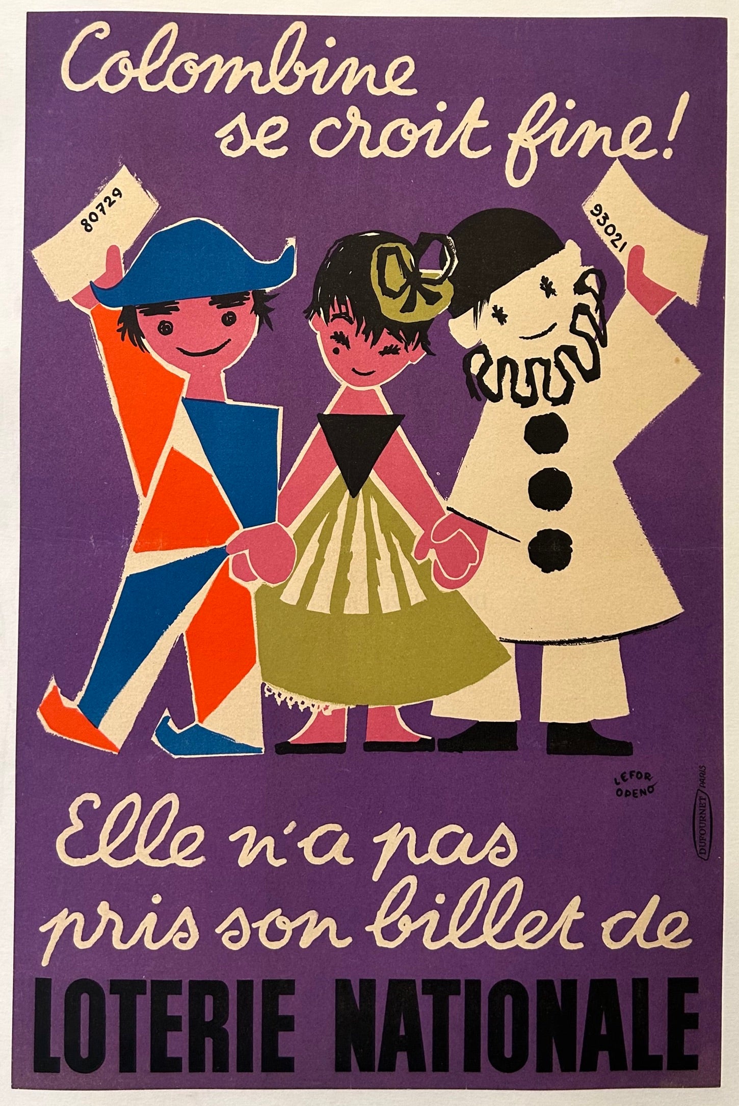 This vibrant purple poster advertises the French national lottery. Depicted are characters from the Commedia dell'arte, a professional theatre troupe from Italy. The cartoonish-style of this poster is absolutely adorable. Loterie Nationale was well known for its cute and quirky posters -- works of art AND advertisements.