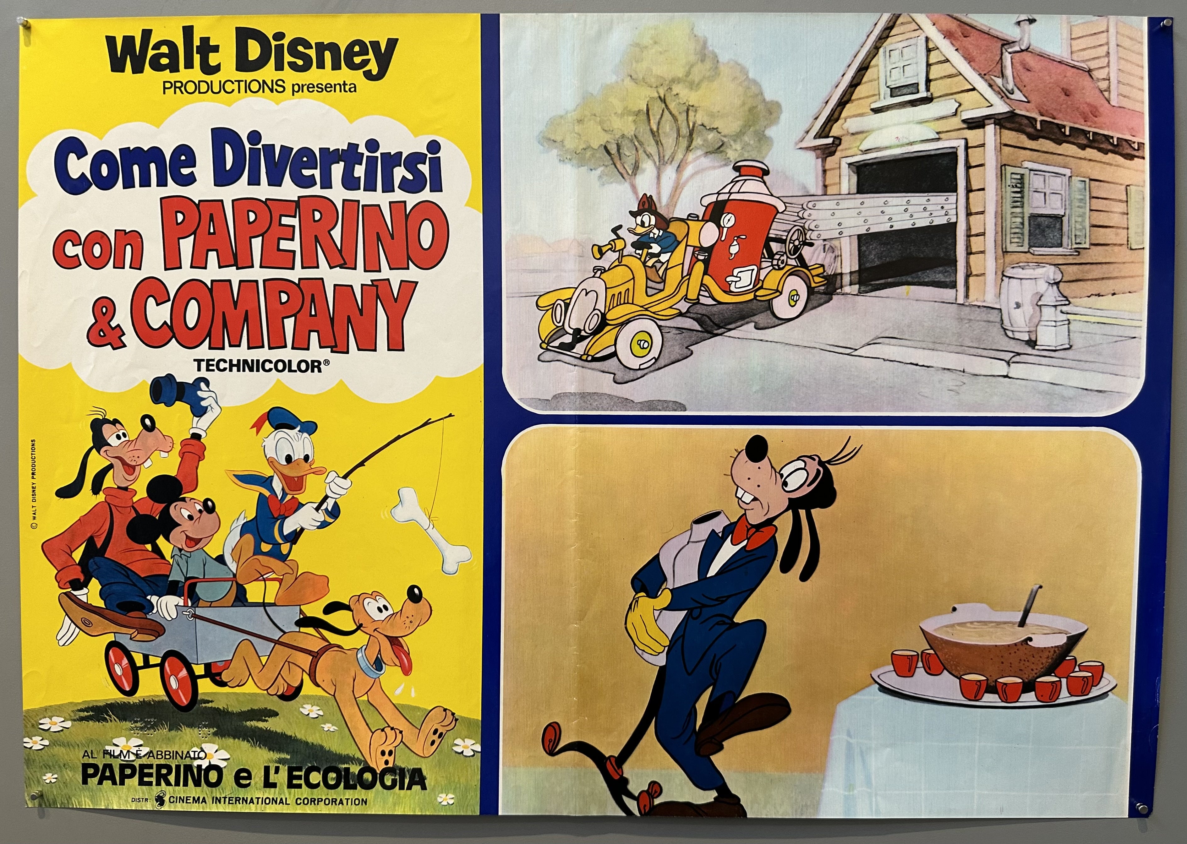 This adorable print shows scenes from the Italian version of the Walt Disney cartoon about Donald Duck, Goofy, and Pluto.