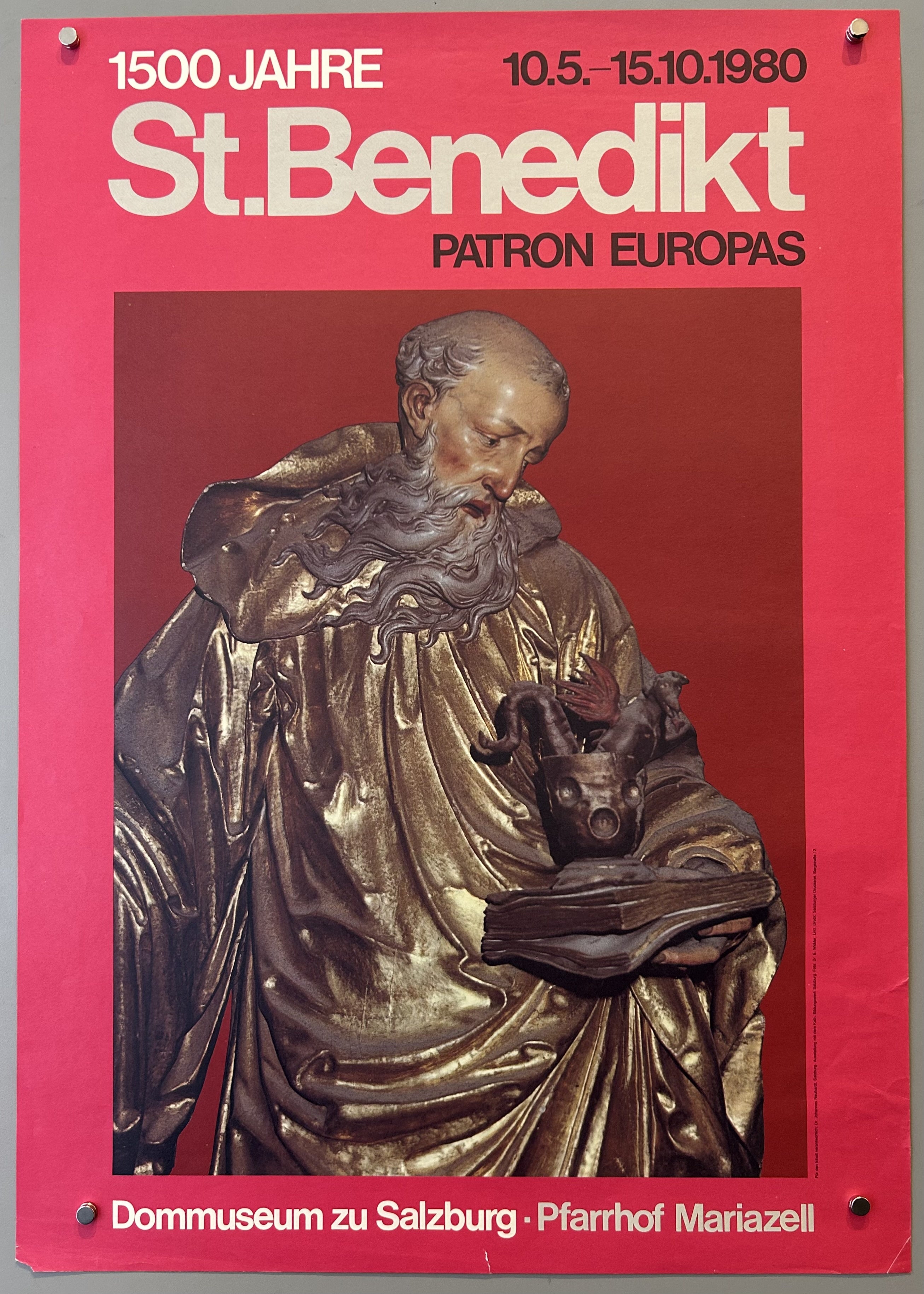 English Translation: "1500 Years / 10.5.-12.10.1980 / St. Benedict, Patron Saint of Europe / Cathedral Museum of Salzburg - Mariazell Parish Hall