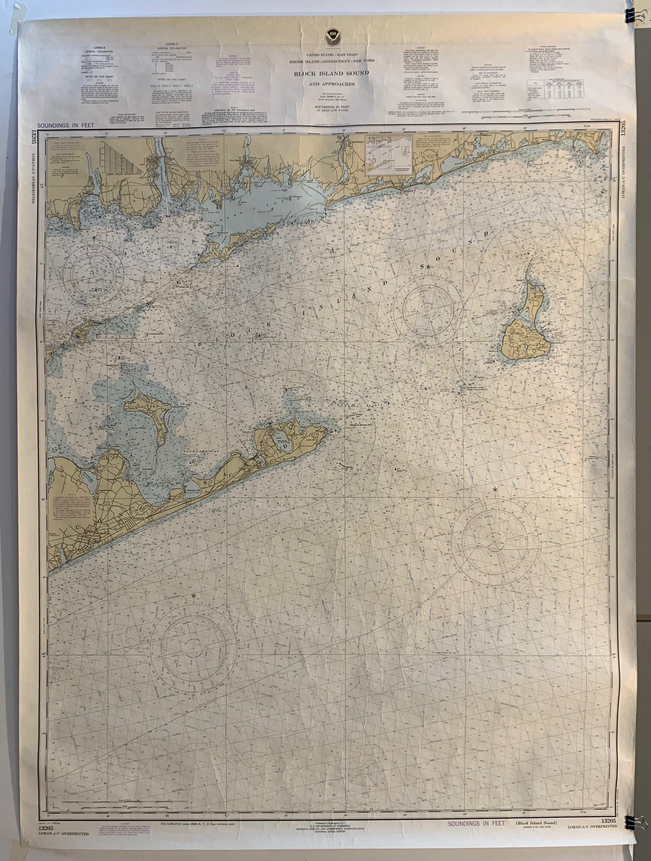 The National Oceanic and Atmospheric Administration (NOAA) created and distributed this map of Block Island Sound and its various points of entry for informational purposes amongst both commercial and recreational mariners by providing soundings in feet, locations of radar reflectors, and a logarithmic speed scale.