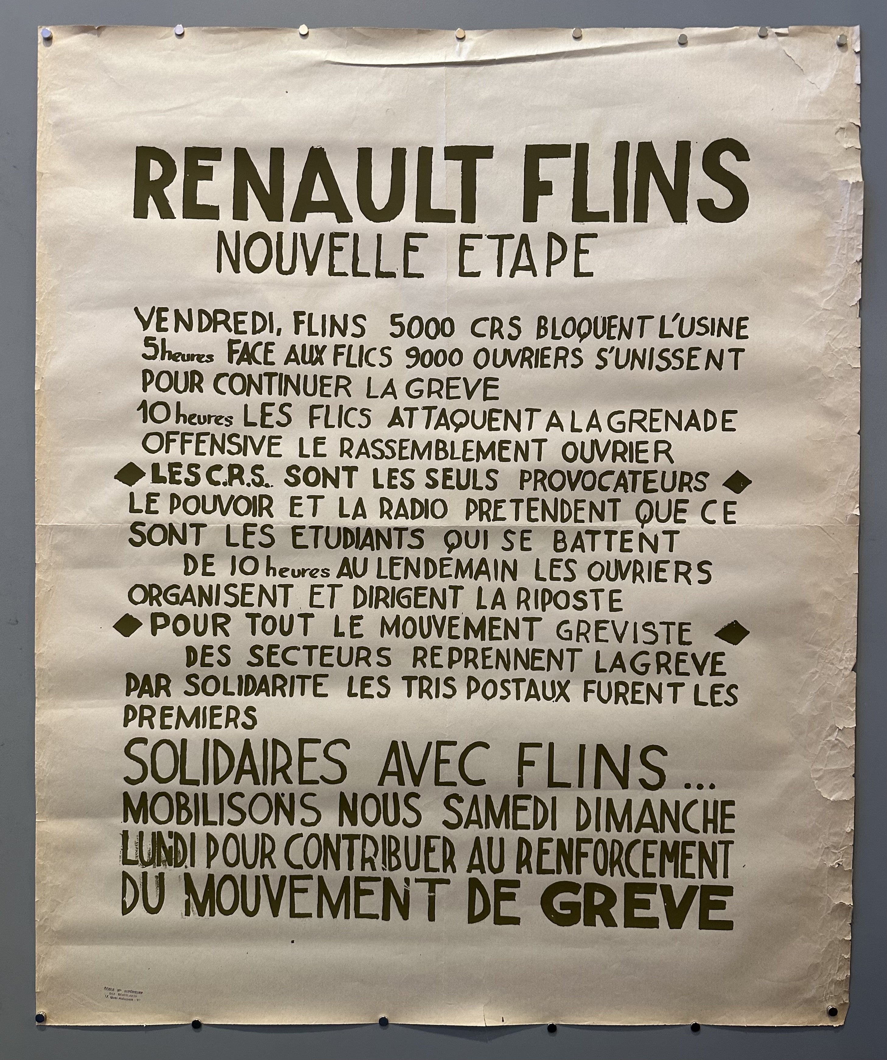 English translation: "Renault Flins / Nouvelle Etape / Friday, Flins 5000 CRS block the factory for 5 hours facing the cops 9000 workers unite to continue the strike / 10 hours the cops attack the workers' gathering with offensive grenades"