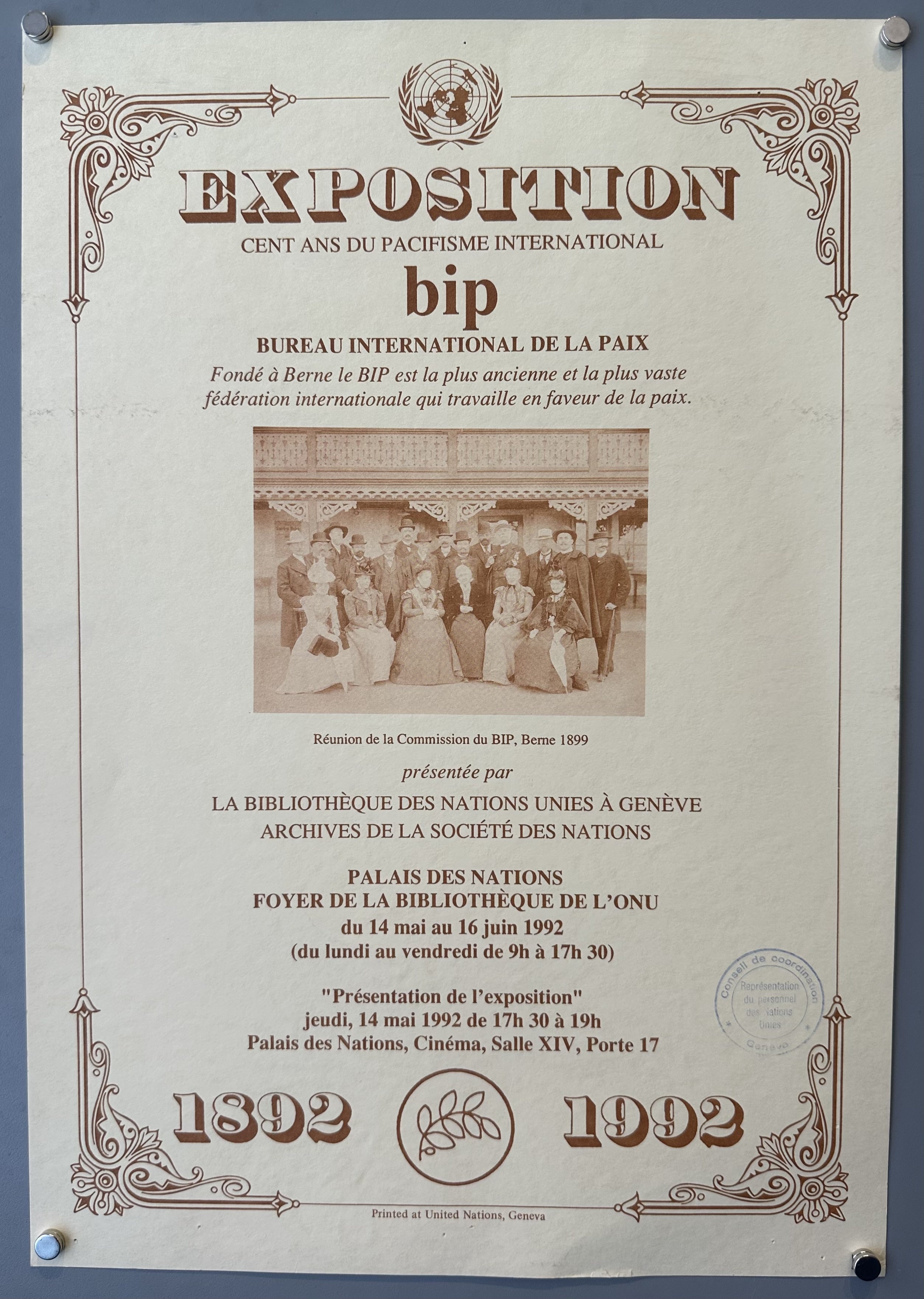 One Hundred Years of International Pacifism was an exhibition marking the centenary of the Bureau International de la Paix (International Peace Bureau), the world’s oldest international peace federation. Founded in Bern in 1891, the Bureau has played a key role in the peace movement and received the Nobel Peace Prize in 1910.