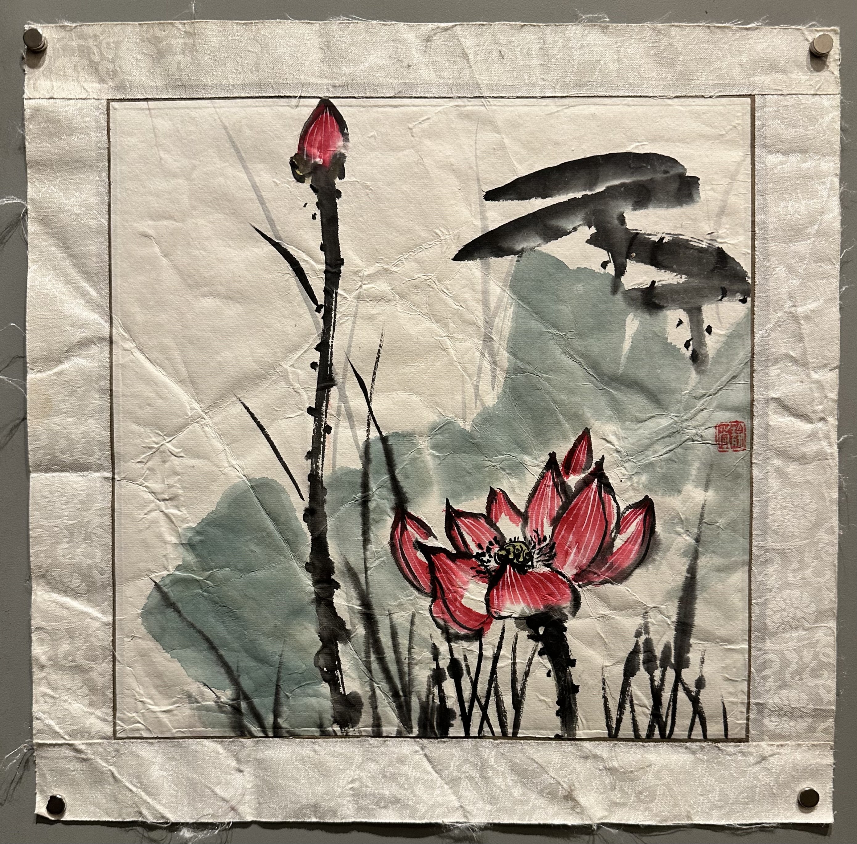 A pink flower bud grows tall next to an already-blossomed flower in an original traditional Chinese ink-and-wash artwork known as guó huà, which is characterized by its watercolor or brush strokes.