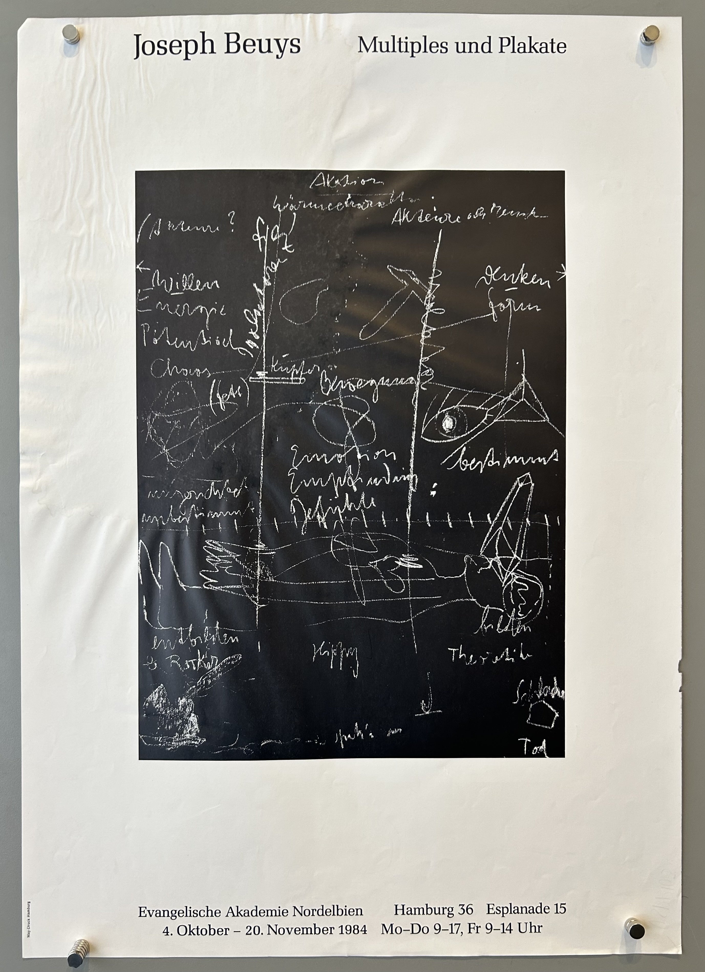 An exhibition of "Multiples and Posters" by artist Joseph Beuys. The exhibition was held at the Evangelische Akademie Nordelbien in Hamburg. Joseph Beuys (1921–1986) was a prominent German Fluxus, Happening, and performance artist, as well as a sculptor, art theorist, and activist. His "multiples" are mass-produced artworks that he used to spread his ideas and make his art more accessible to the public.