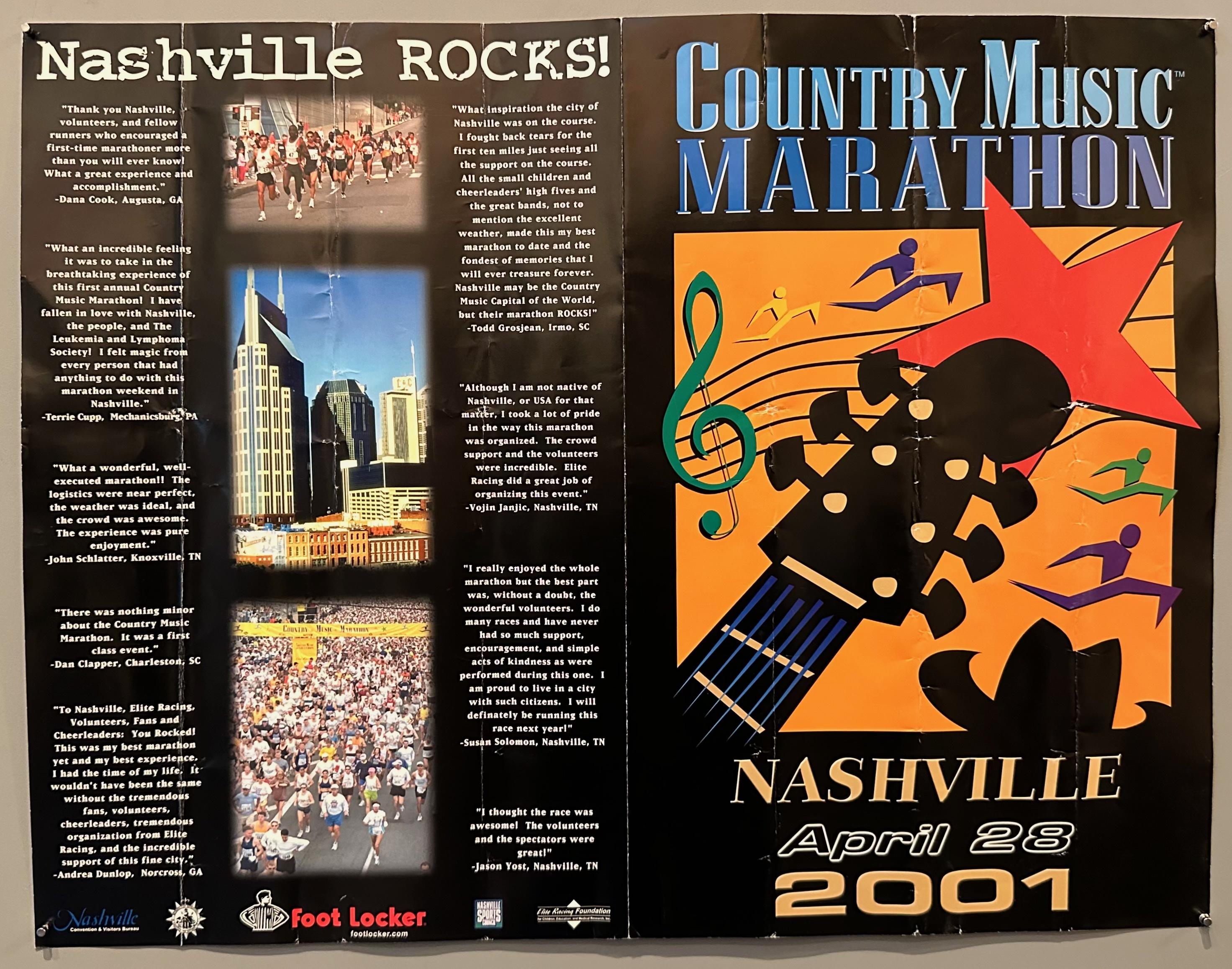 This poster includes testimonials from past country music marathons to promote 2001's upcoming race. The backside contains more information about the event, including live bands, cheer teams, and a beautiful course.