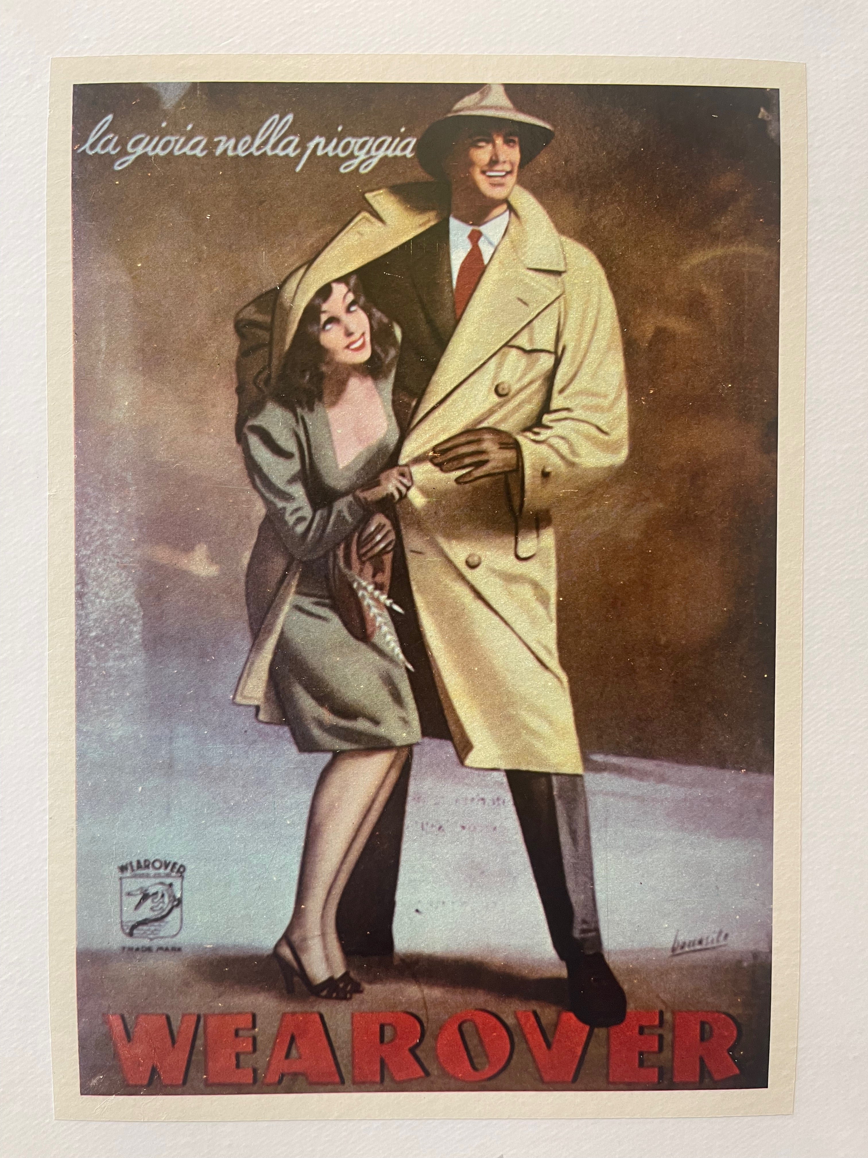 This Italian advertising poster features a man wrapping his rain jacket around a woman to keep her dry too. While the brand does not seem to exist anymore, this print sure does keep Wearover alive in our hearts. The original print is currently in the National Museum of the Sale Collection in Treviso, Italy.