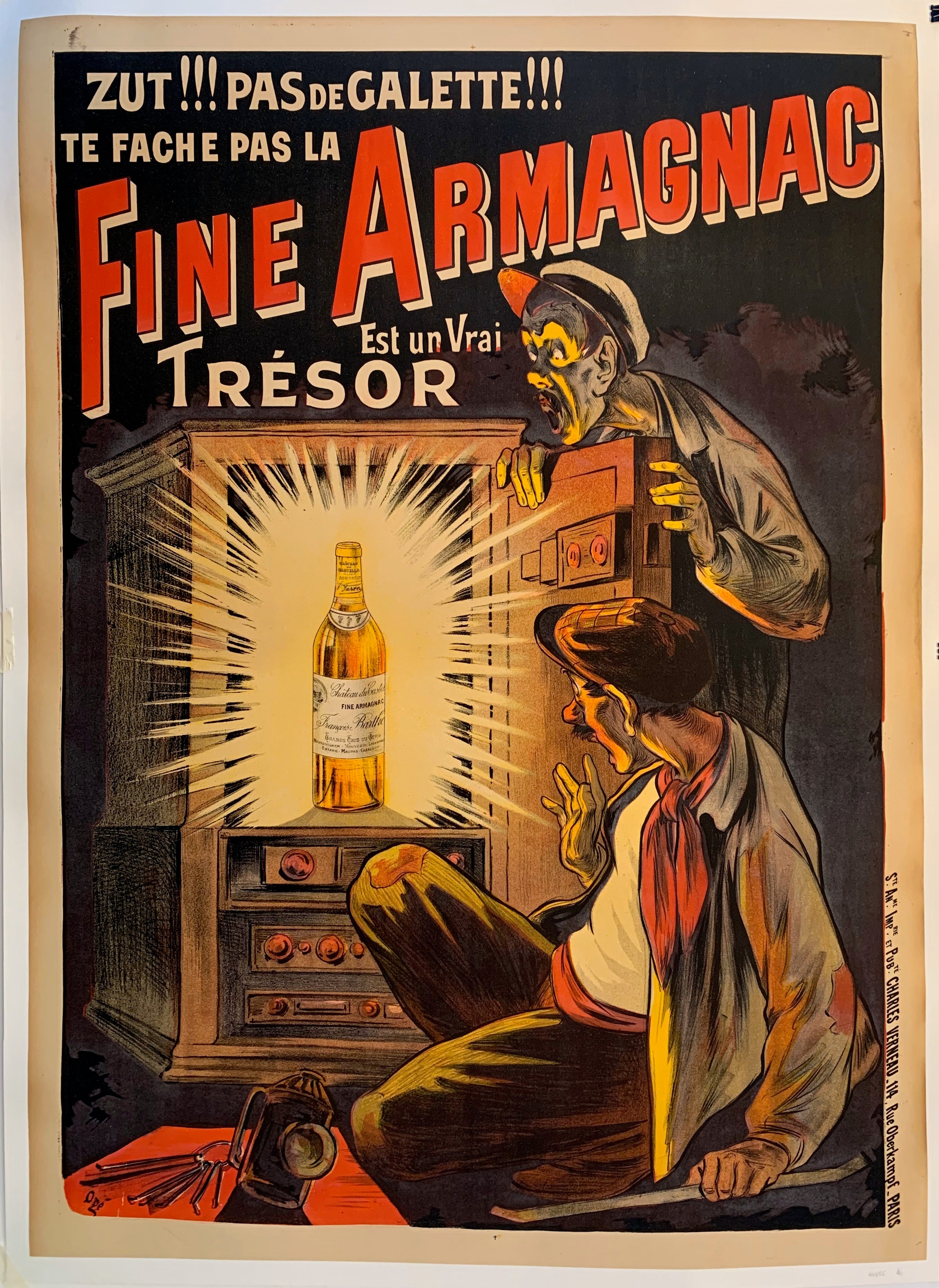 Vintage French poster from the turn of the century advertising Fine Armagnac brandy. Illustrated is a comic scene—two robbers open a chest, anticipating money, but find the Armagnac instead. Which is, for all intents and purposes, the superior treasure.