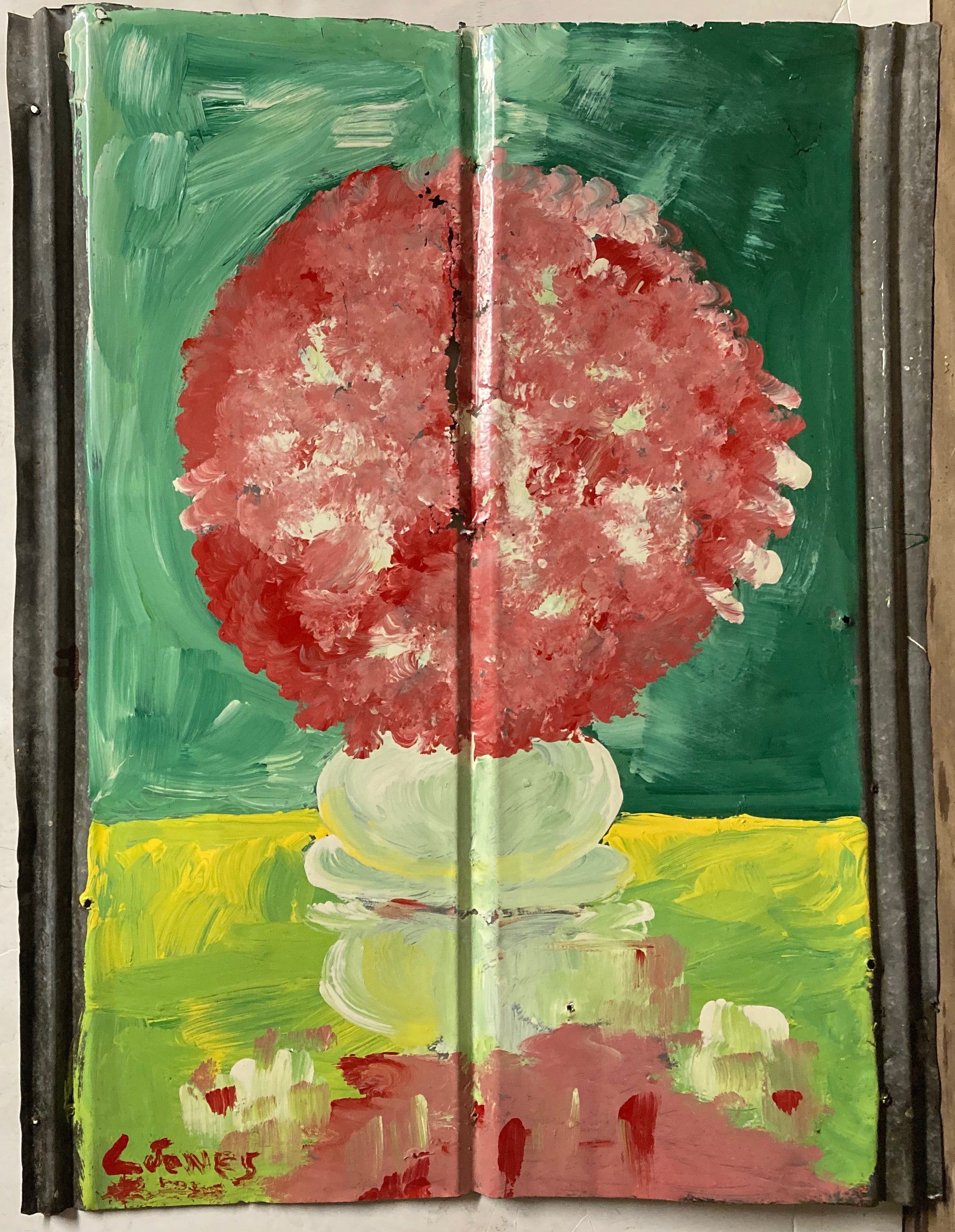A native Georgian, Leonard Jones taught himself to paint when he was in high school. His works are greatly inspired by scenes from his childhood, images of rural living in the South including housewives, church-goers, and laborers. A folk artist who is often considered an outsider, Jones paints to capture candid daily life and the beauty found in the community around him.The use of scrap wood or tin roofing alludes to the buildings he grew up with, and he often incorporates these materials into the paintings themselves. The materials are covered in bold backgrounds of color, which Jones paints subjects over using his fingers or the handles of brushes, leaving a distinctly Leonard Jones work of art.