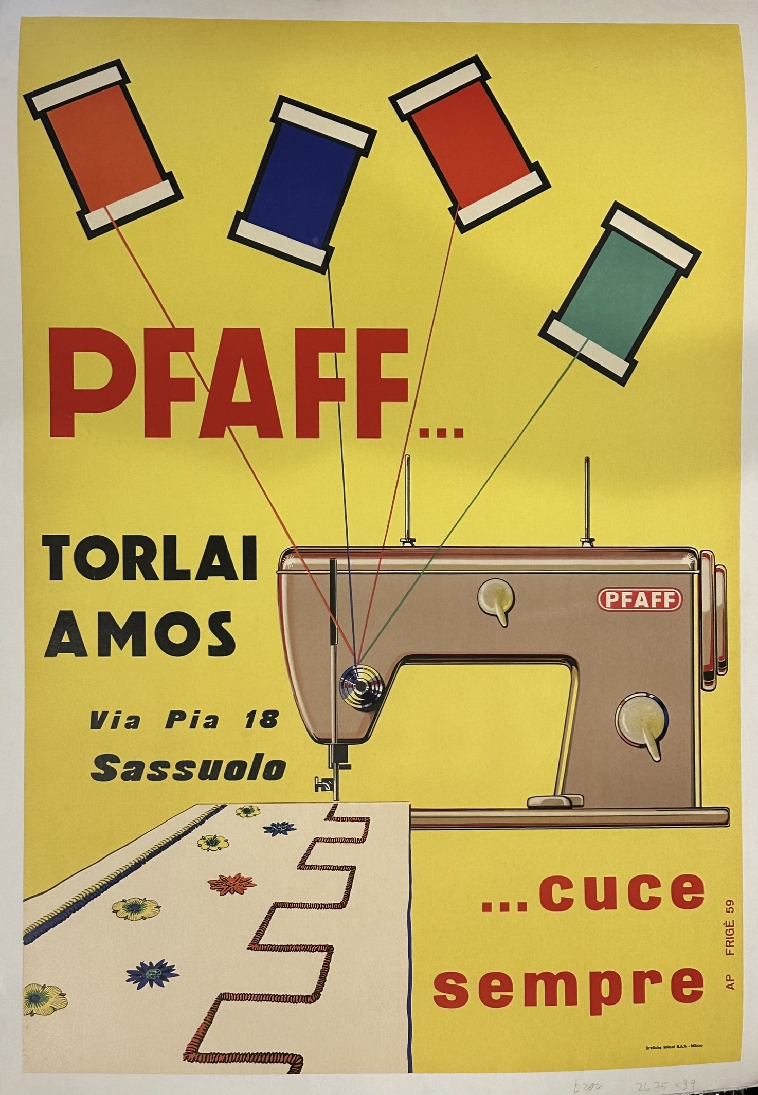 For Pfaff sewing machines, specifically promoting the Pfaff Torlai Amos store located at Via Pia 18 in Sassuolo. The text "...cuce sempre" translates to "...always sews," emphasizing the reliability and continuous performance of Pfaff sewing machines.