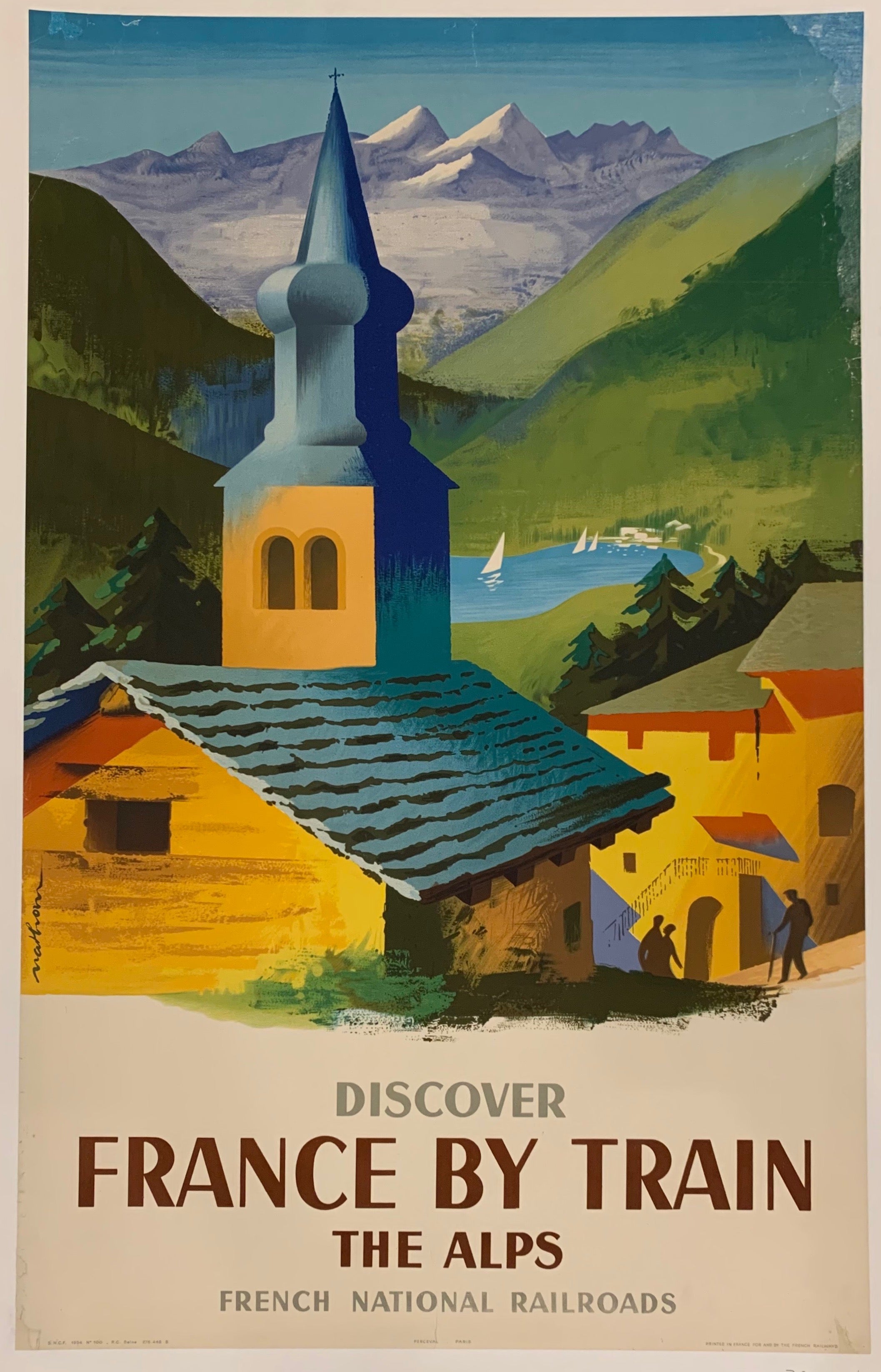 This beautiful original poster advertises travel to the French Alps. A lovely chapel sits in the crest of lush green valleys, the snow-capped mountains peeking out below. As part of a way to promote tourism across France, the French Railways (SNCF) had a mass campaign showcasing the beauty of different French regions.