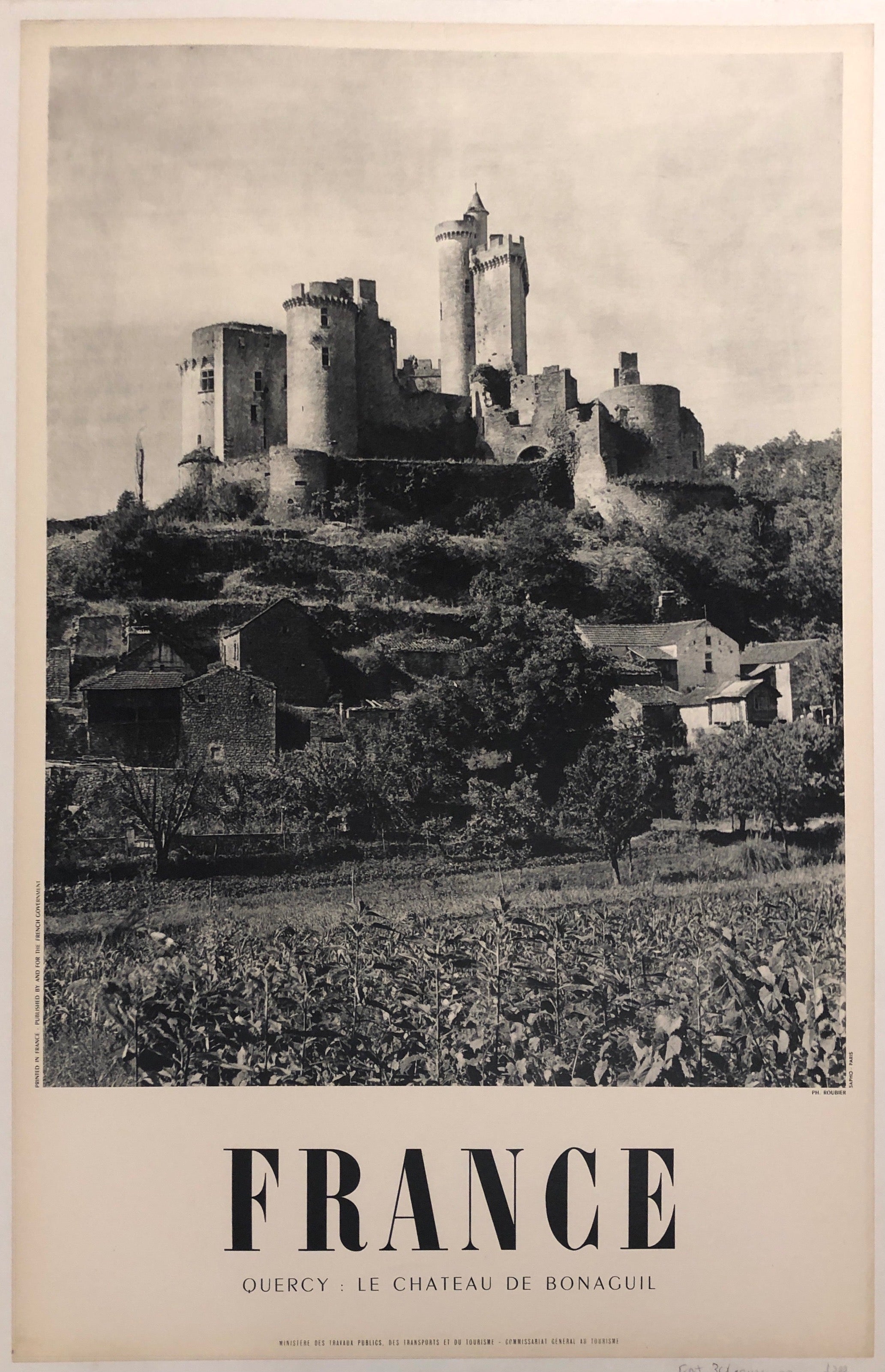 Vintage poster for the Quercy province of France. The poster features a stunning black and white photograph of the Bonaguil Castle, a relic of Medieval-era defense dating back to the 13th Century.