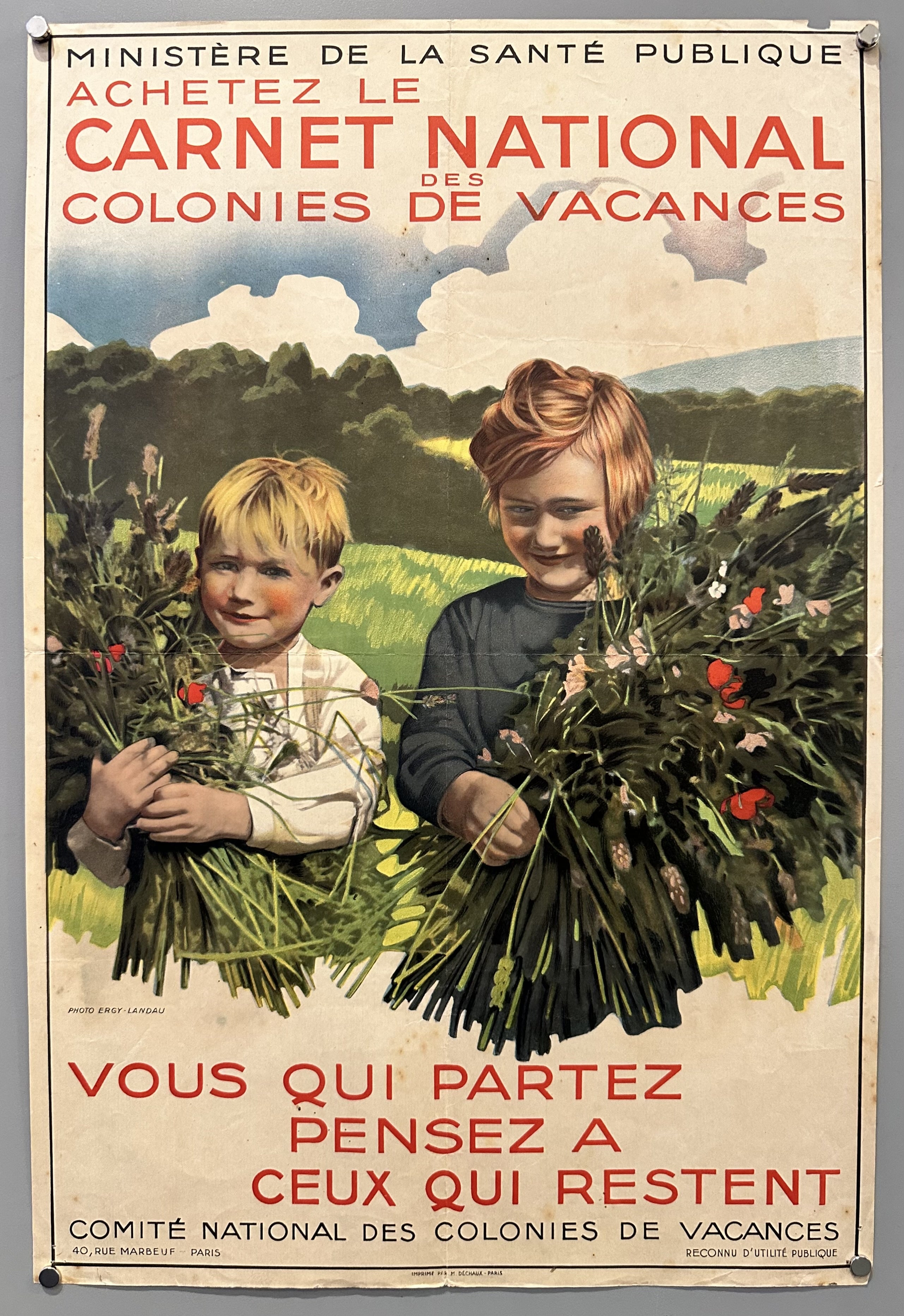 Encourages the public to buy a National Booklet, essentially a book of donation coupons, to fund "Colonies de Vacances" for children whose families could not afford them. A national fundraising effort to send underprivileged children to summer camps, commissioned by the National Committee for Summer Camps under the Ministry of Public Health.