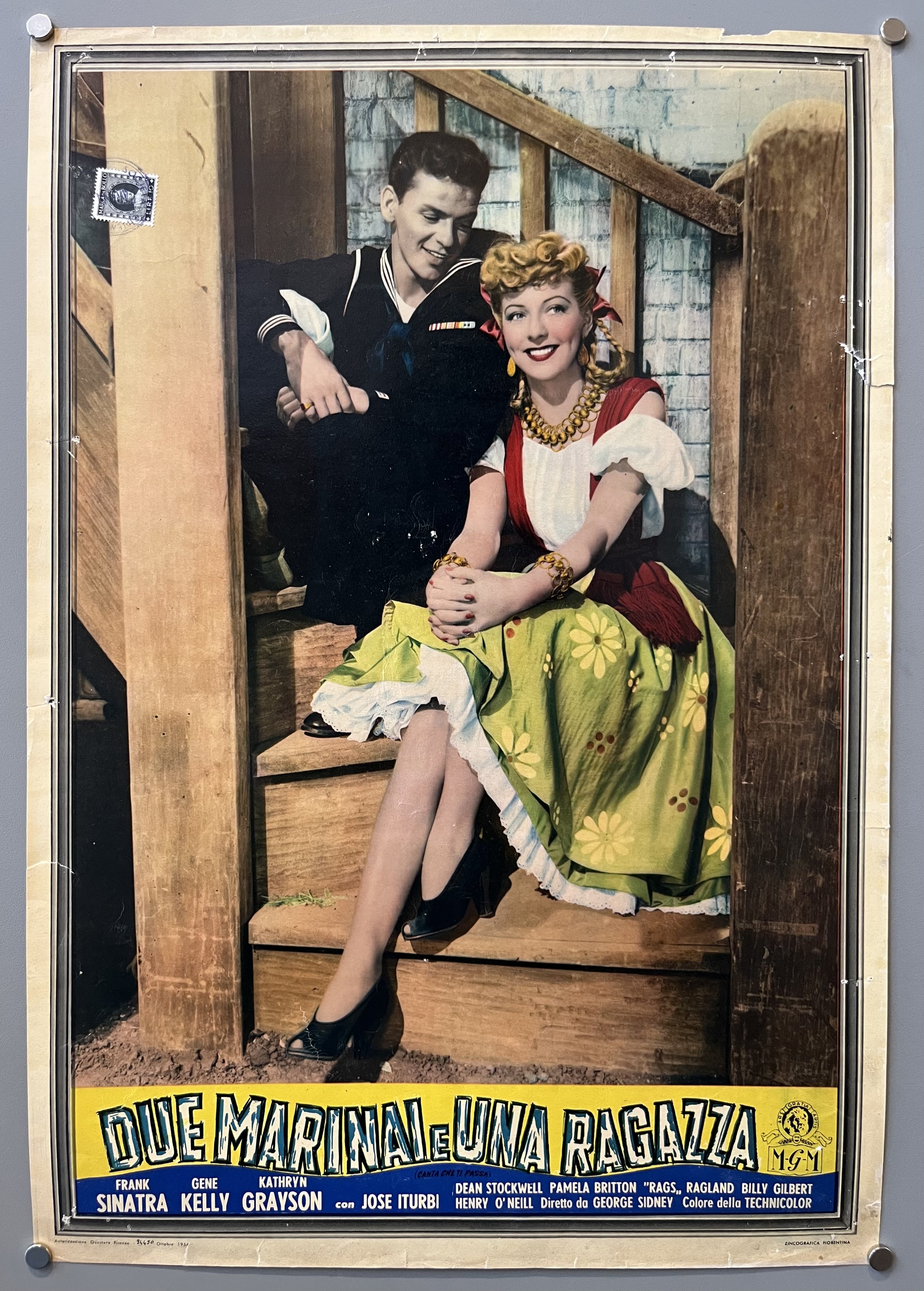 Italian film poster for 'Anchors Aweigh' (1945), starring Frank Sinatra, Gene Kelly, Kathryn Grayson, and Jose Iturbi.