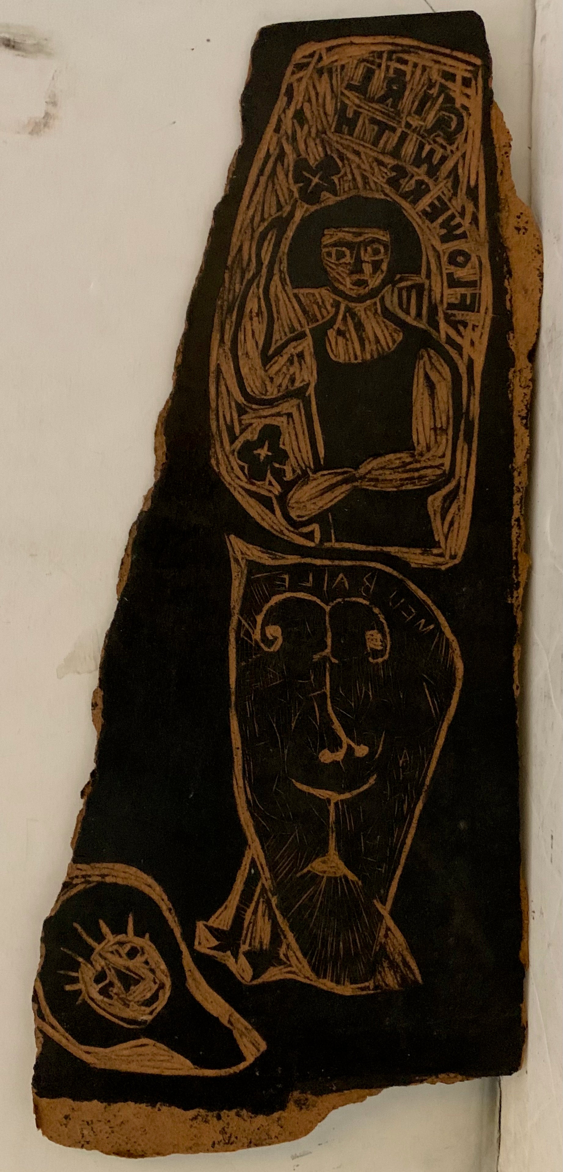 Original woodblock by Brazilian artist Joaquim Pedro Ribeiro Araujo. This handcrafted woodblock is a plate Joaquim used to make his prints. The images carved in this woodblock are scattershot, and together the composition has a chaotic, surreal quality. On the top of the carving is a girl with flowers, labeled as such. Below her are two eery masks. Joaquim was preoccupied with spiritualism and Buddhism throughout his career, and these themes usually carried over into his artwork. The rough wood carvings in this piece lend the design a degree of texture and depth that the two-dimensional prints could not achieve on their own.