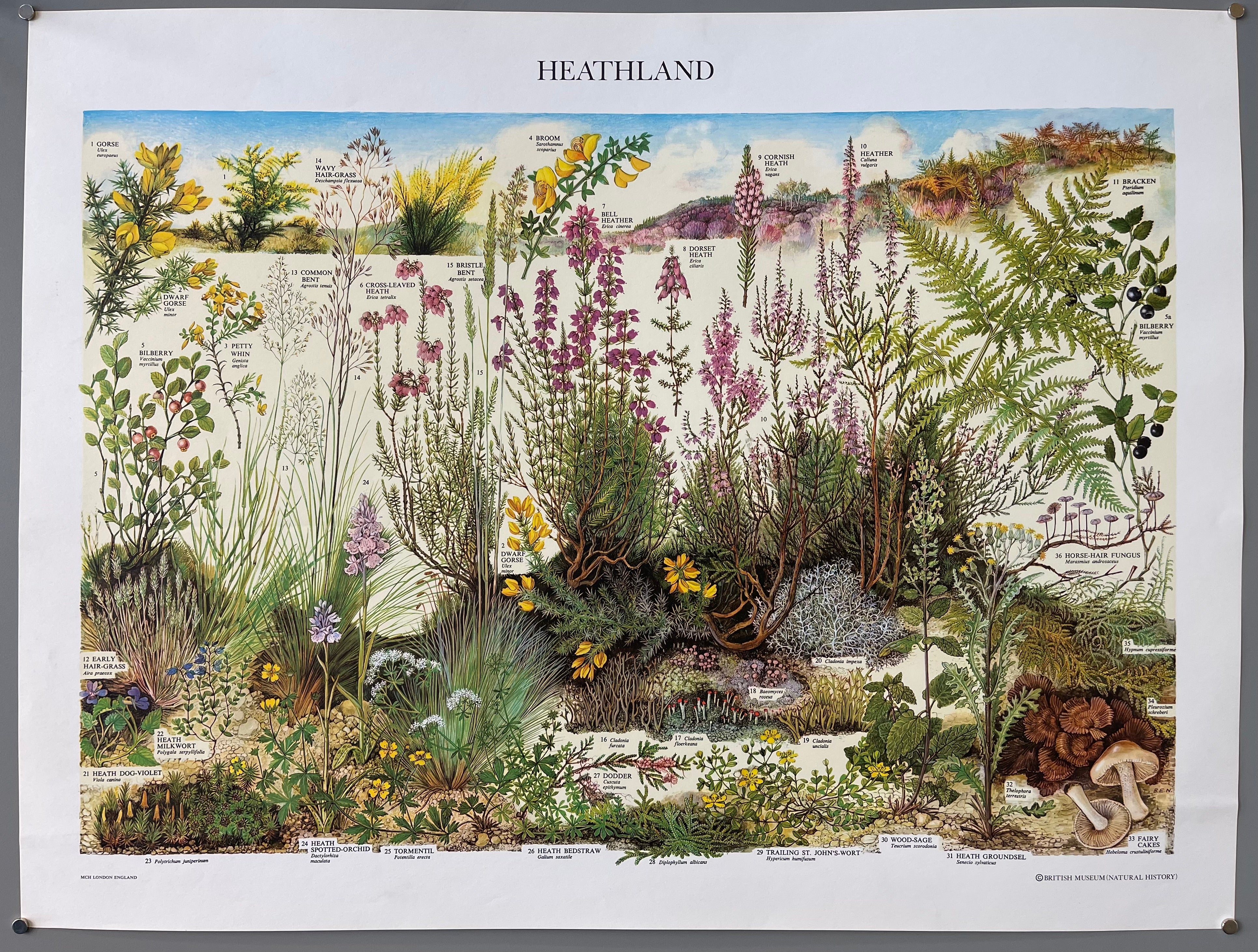 A magnificently detailed illustration of all the plant varieties in the heathland, each plant carefully labeled. The poster is from a collection featured in the British Museum of Natural History.
