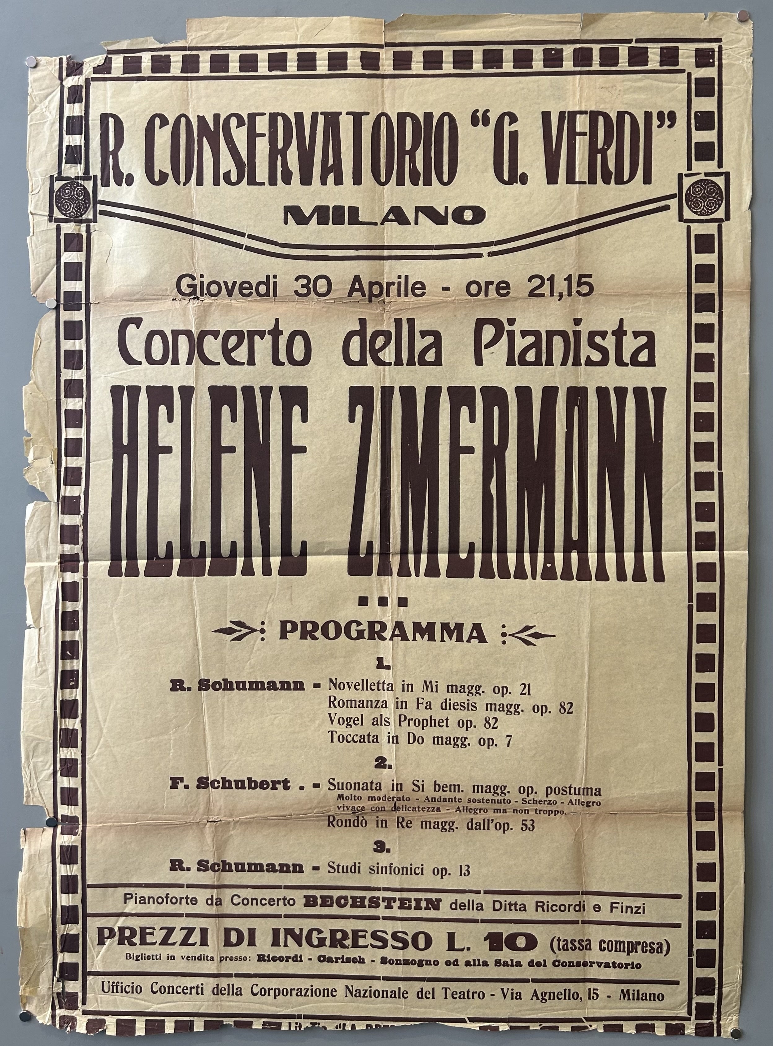 This Italian poster advertises a concert given by the pianist Helene Zimermann in Milan, and contains the program, date and time, and ticket prices.