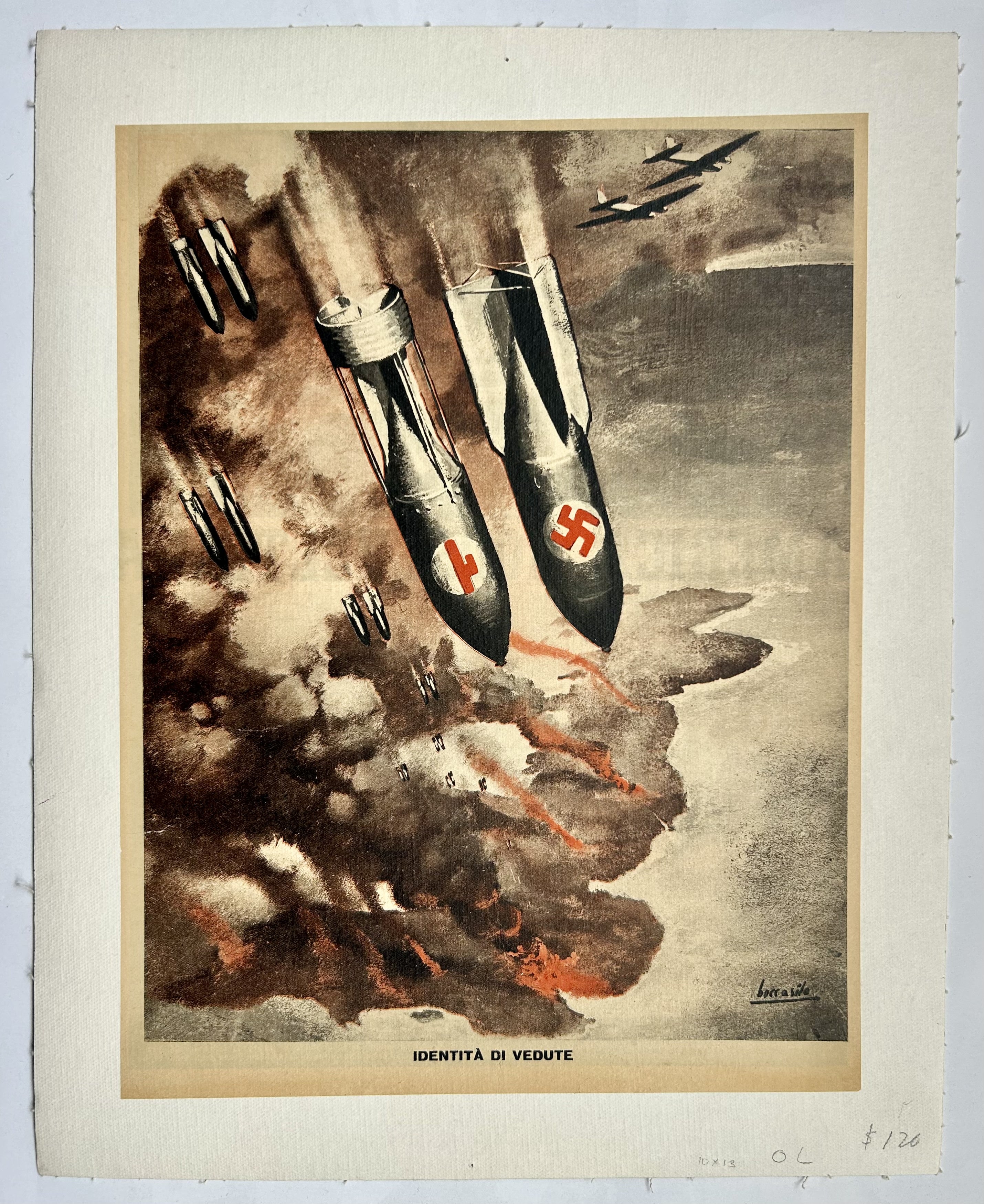 Fascist poster by a supporter of Benito Mussolini. The artist, Boccasile, produced propaganda material for his government. As the tide of war turned against Fascism he became more involved in it, supporting the German puppet state, RSI, established by Mussolini in Northern and Central Italy after his liberation from the Gran Sasso exile. Boccasile enlisted in the Italian SS Division, drawing their recruitment posters and illustrating propaganda material.