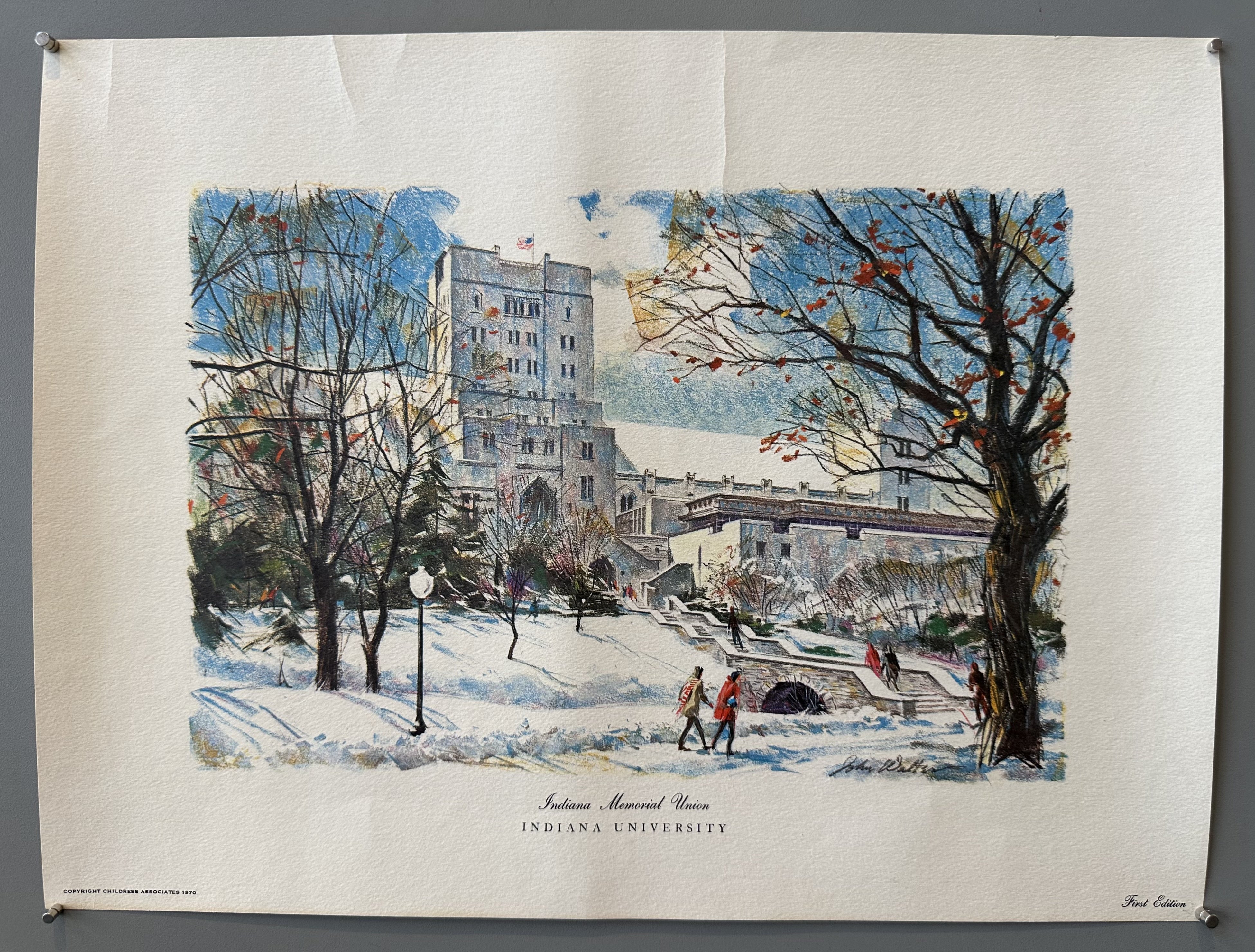 First edition print -- a serene illustration of the Indiana University campus during winter.