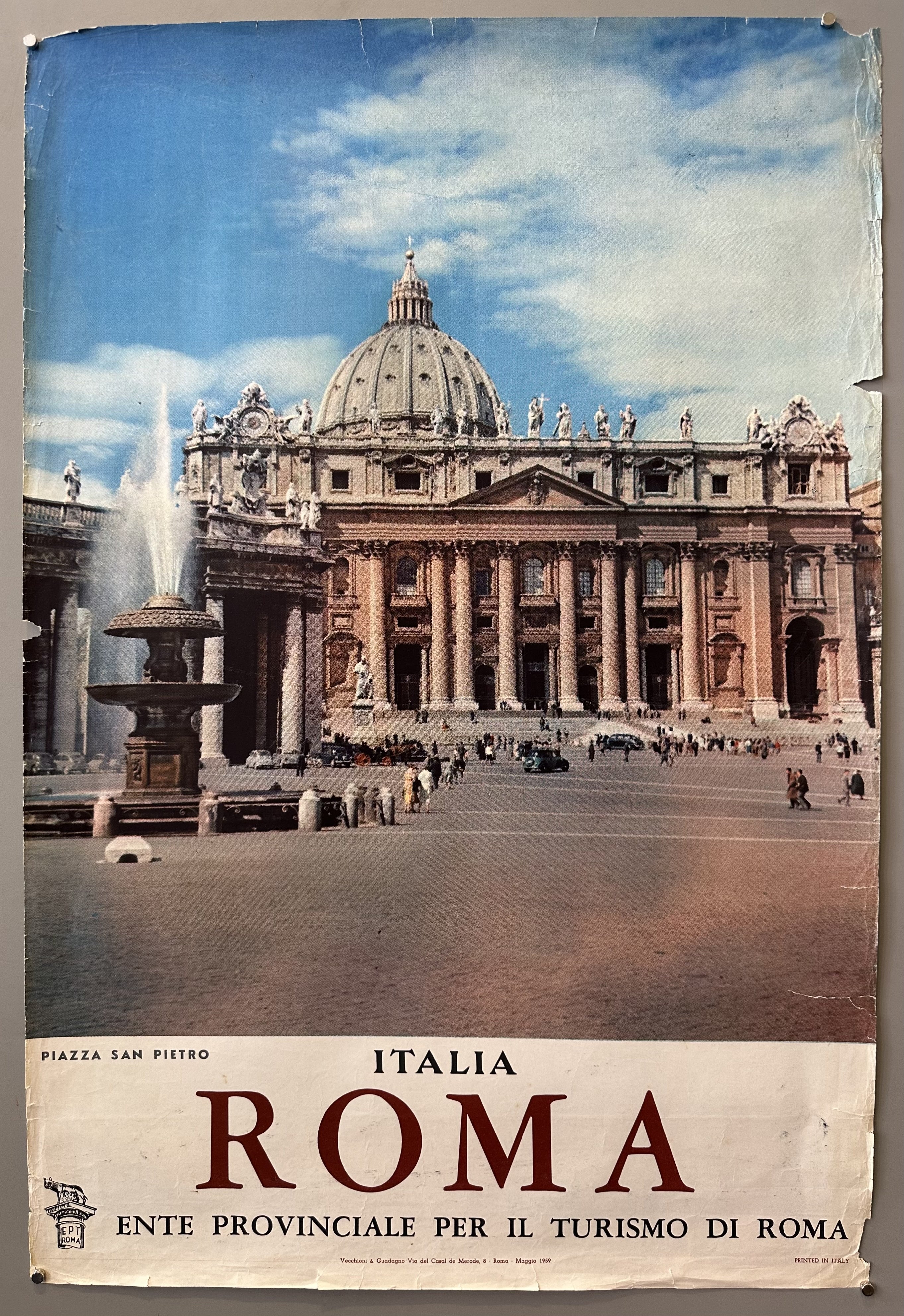 Original travel poster for visits to Rome, showing the Piazza San Pietro in full color.