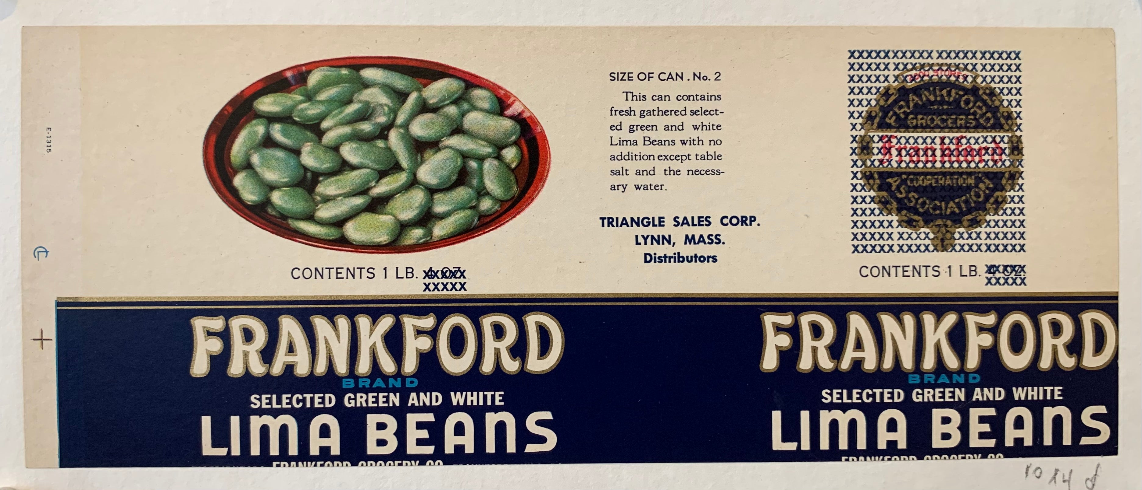 A small horizontal can label for Frankford's green and white lima beans. Features an artistic rendition of these alleged beans so you know exactly what you're getting yourself into.