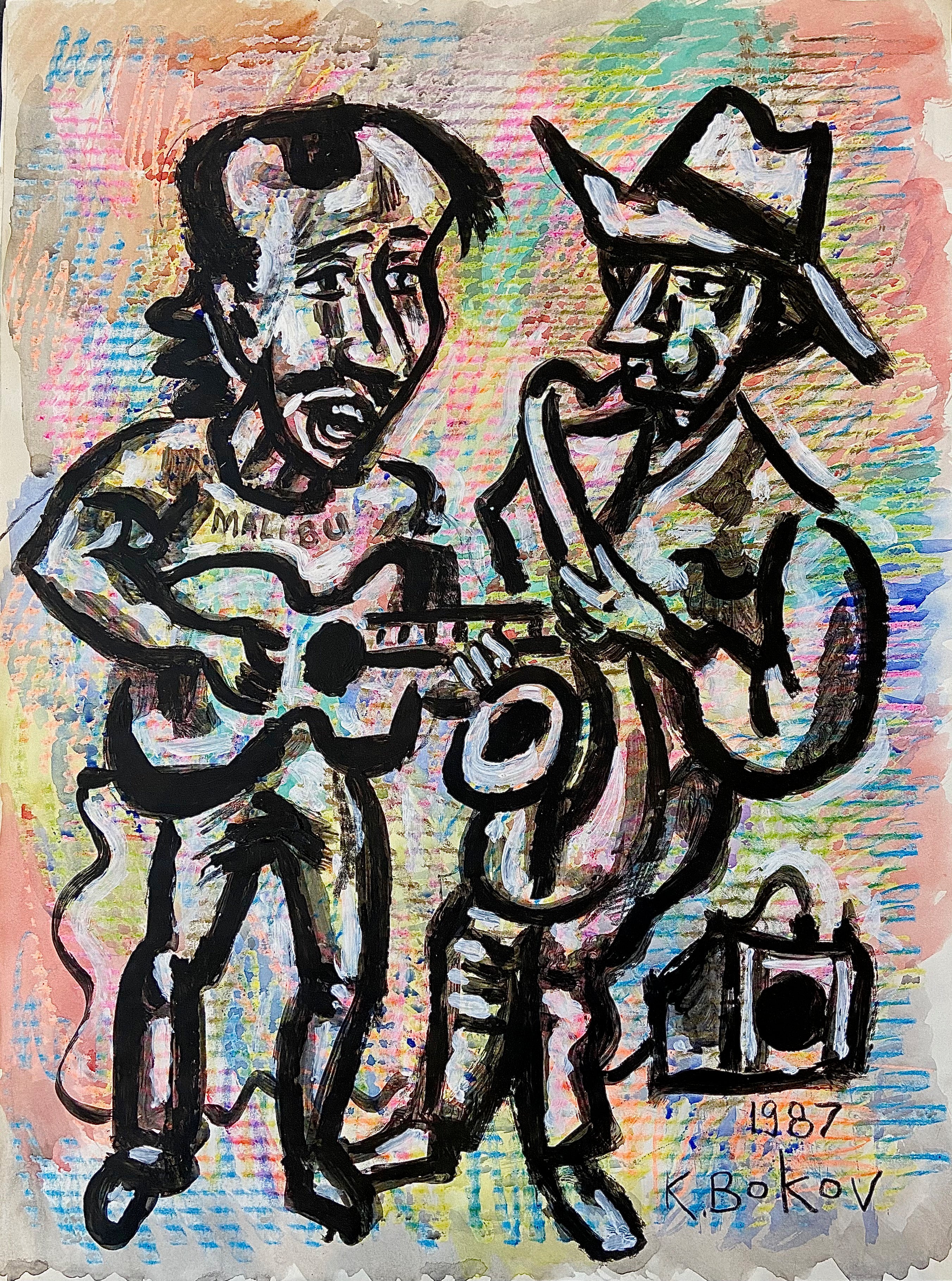 Konstantin Bokov is a Ukranian-American artist with a distinctly New York City influence. Bokov was born in 1940 in Shotska, Ukraine. A love for art ran in his family—his father is the renowned Soviet poet and songwriter Viktor Bokov—and at their behest Bokov attended the Art Academy of Leningrad in St. Petersburg to study music. Upon graduating university Bokov moved to Moscow, and it was there that Bokov saw Van Gogh’s painting, Red Sunset. The painting was a transcendent experience, and it convinced Bokov that his future lay not in music but rather visual art. In 1974, Bokov immigrated to New York City and started his art career, creating paintings, found-object sculptures, and public installations. He was a member of the Rivington School, a movement that originated from the East Village art scene of the 80s. Bokov’s art feels like a window into this bygone era of the city, and scenes of everyday city life are common themes in his work.