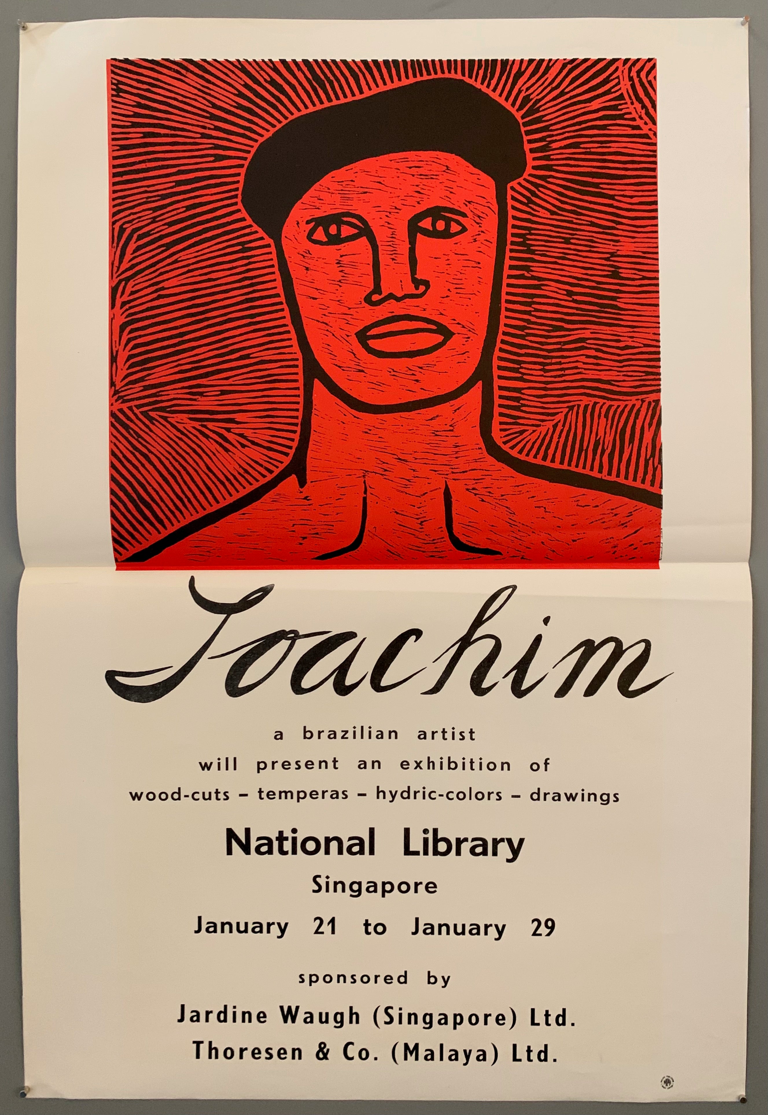 "Joachim a Brazilian Artist will present an Exhibition of Wood-Cuts, Temperas, Hydric Colors, Drawings. National Library. Singapore. January 21 to January 29."