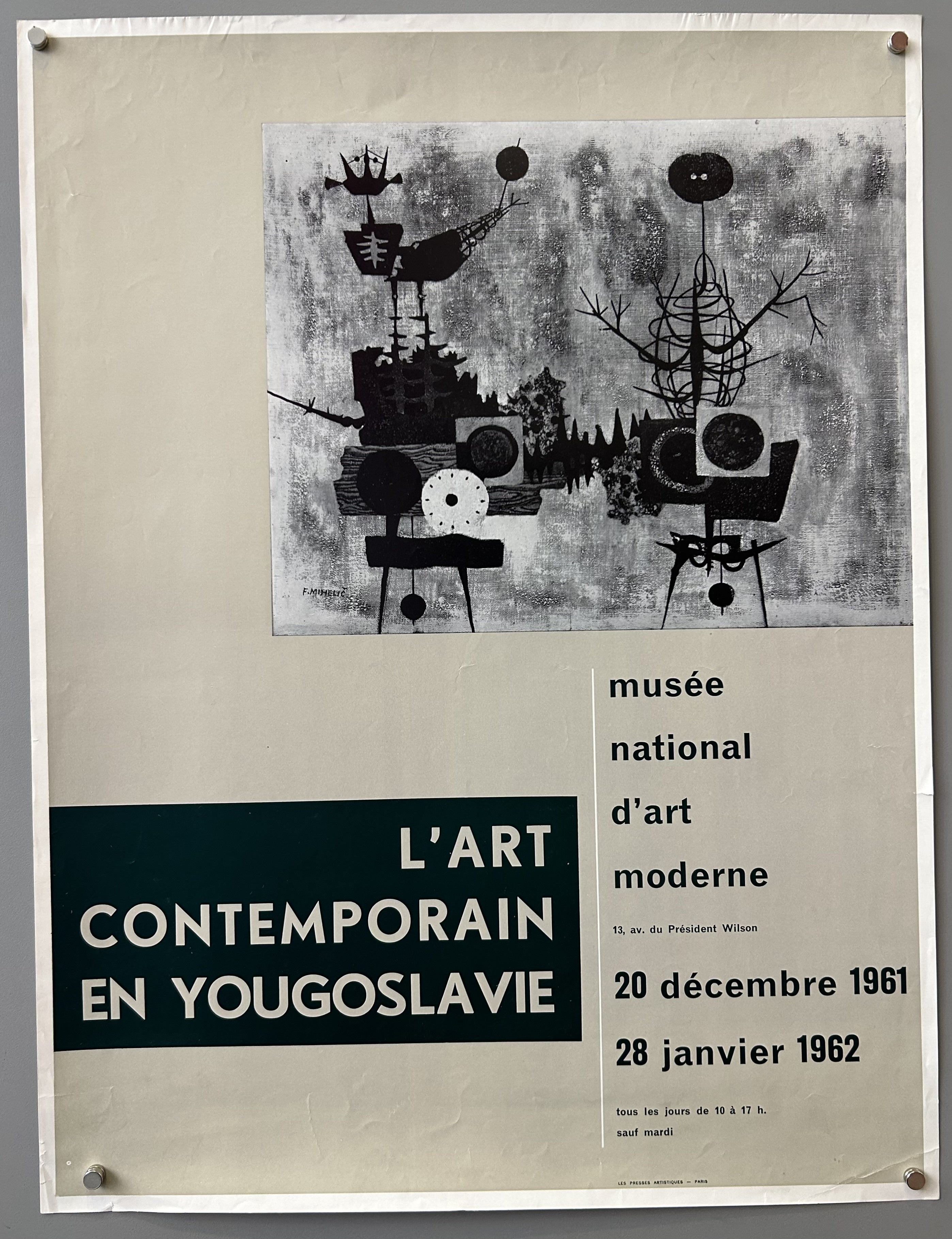 English Translation: "Contemporary Art in Yugoslavia / National Museum of Modern Art 13, President Wilson Avenue / December 20, 1961 / January 28, 1962 / Every day from 10 a.m. to 5 p.m. except Tuesday"