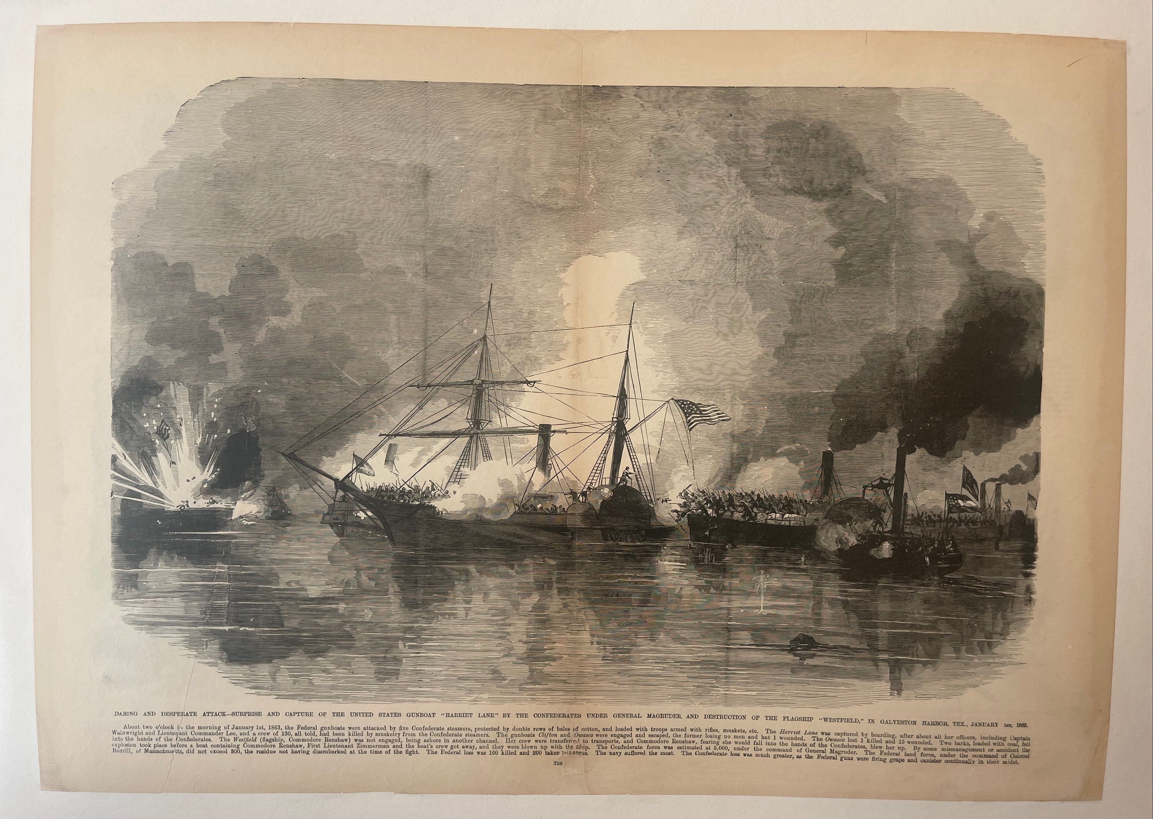 This illustration depicts the First Battle of Galveston Harbor during the American Civil War when Union forces saw the gunboat Harriet Lane captured by Confederate forces.