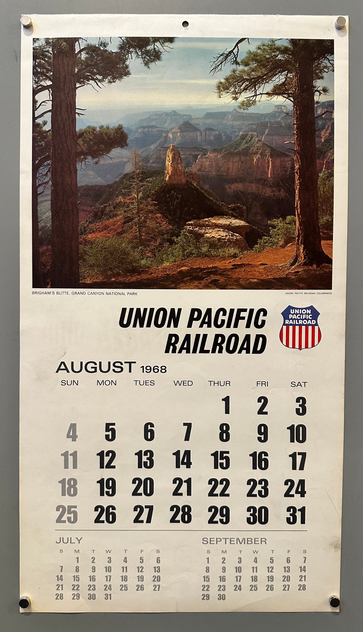 A double-sided calendar from Union Pacific Railroad with a photograph of Brigham's Butte in the Grand Canyon on the back for the month of August.