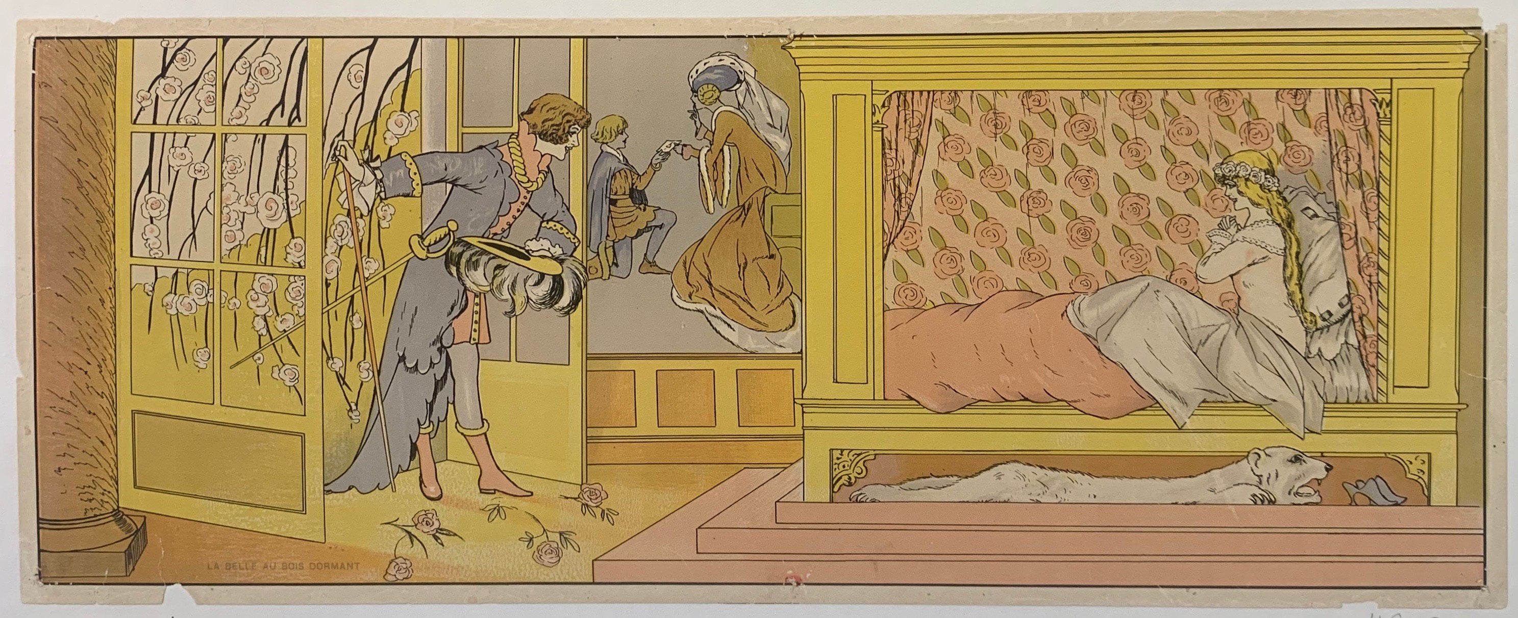 This vintage print is part of a collection of prints illustrating classic French fairy tales. The soft colors and ornate details perfectly capture the romantic fantasy of Sleeping Beauty.