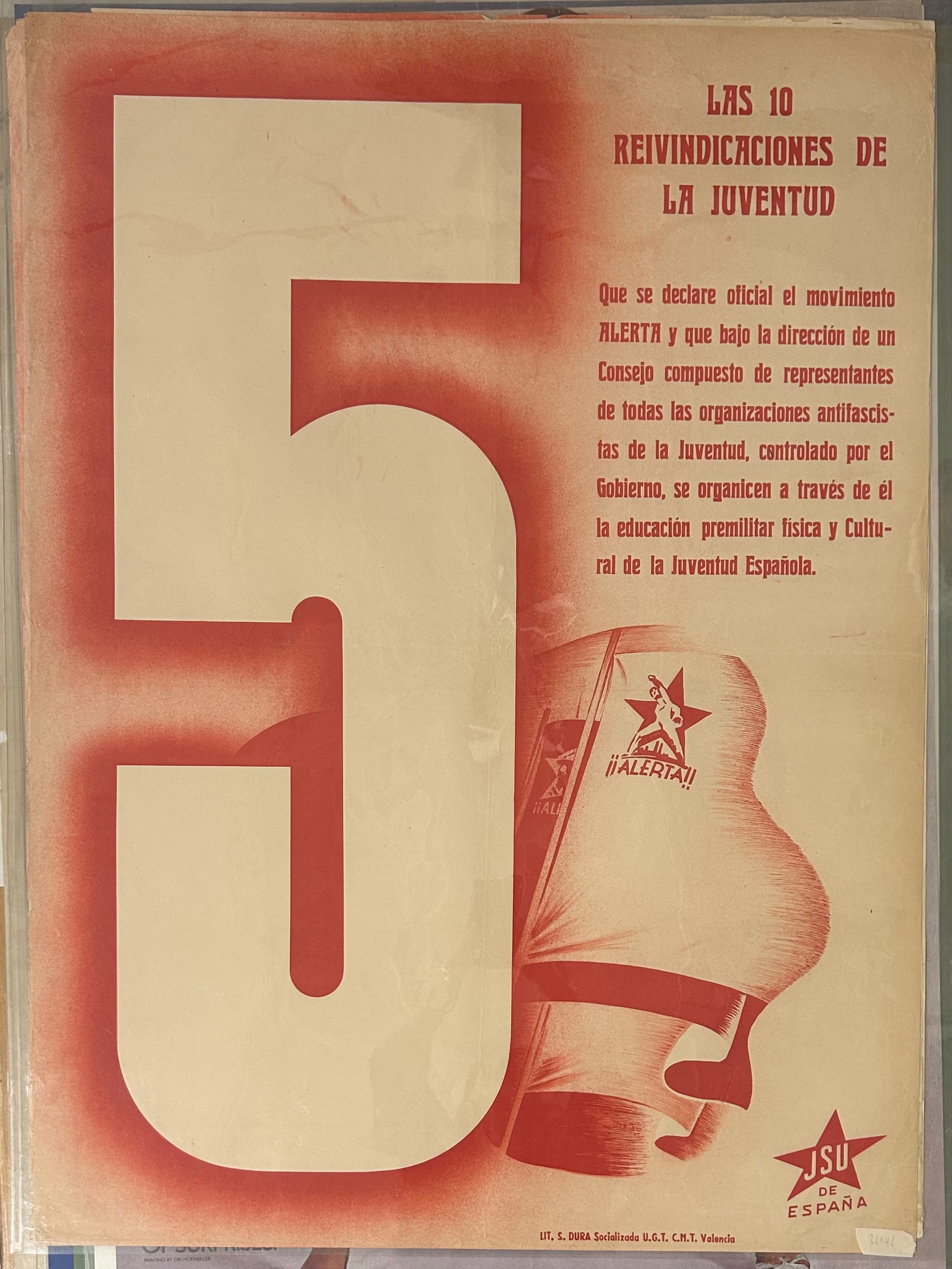 Published by the Unified Socialist Youth (JSU), this is part of a 10-piece Spanish Civil War collection listing the demands of the young Spanish socialists.