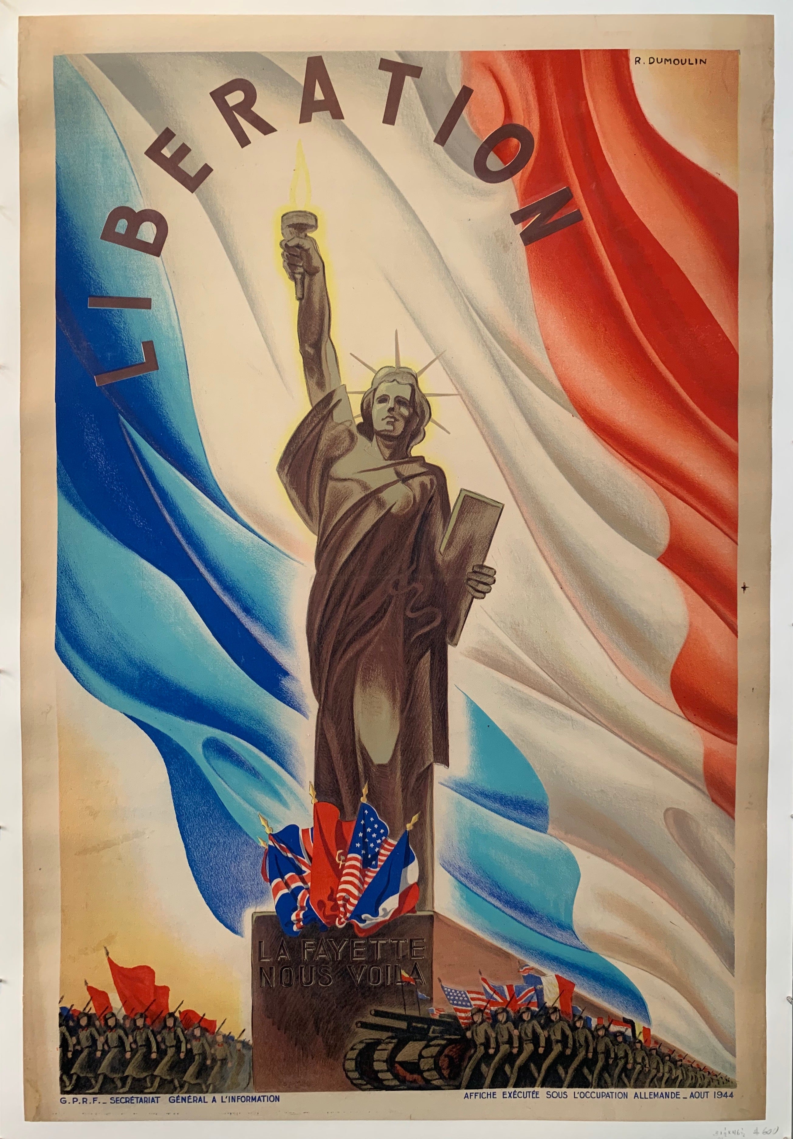 This inspiring poster was made during Germany's occupation of France in World War II. The statue of libery, a symbol of freedom gifted from France to the USA stands in front of a waving french flag, with the allies flags underneath: England, Russia, America, and France. At the very bottom, soldiers march, showing they're prepared to war. On the statue, an engraving says "Lafayette Nous Voila (Lafayette We Are Here).