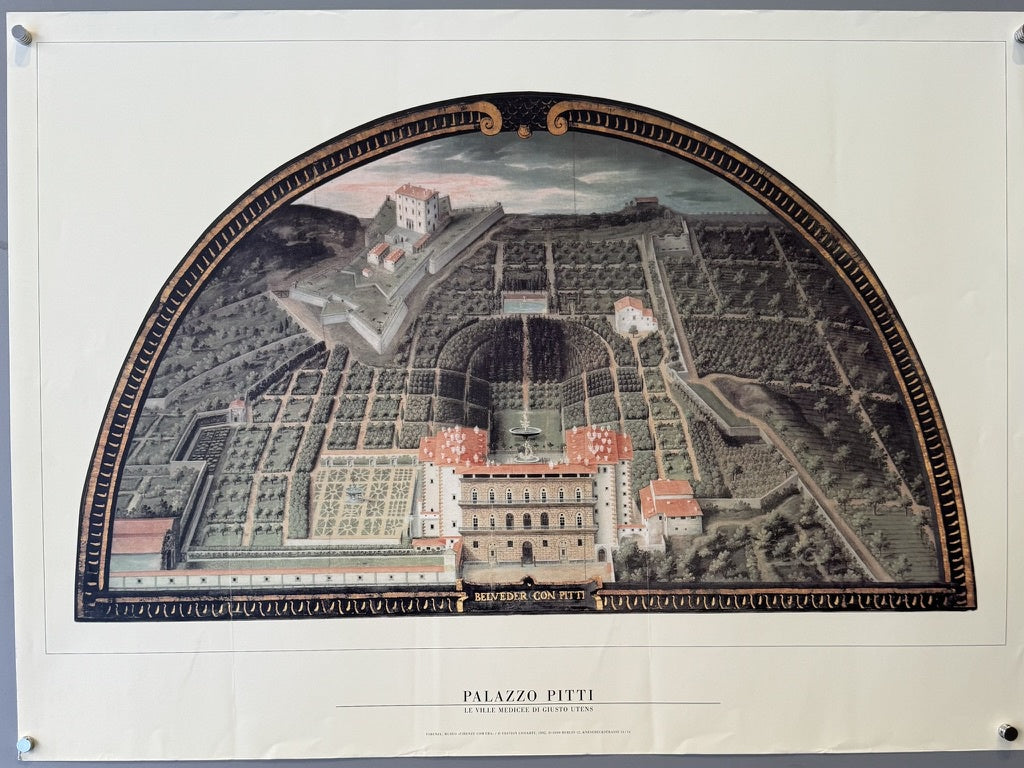 Depicts the Palazzo Pitti and Forte Belvedere in Florence, Italy, based on a 1599 lunette painting by Giusto Utens.