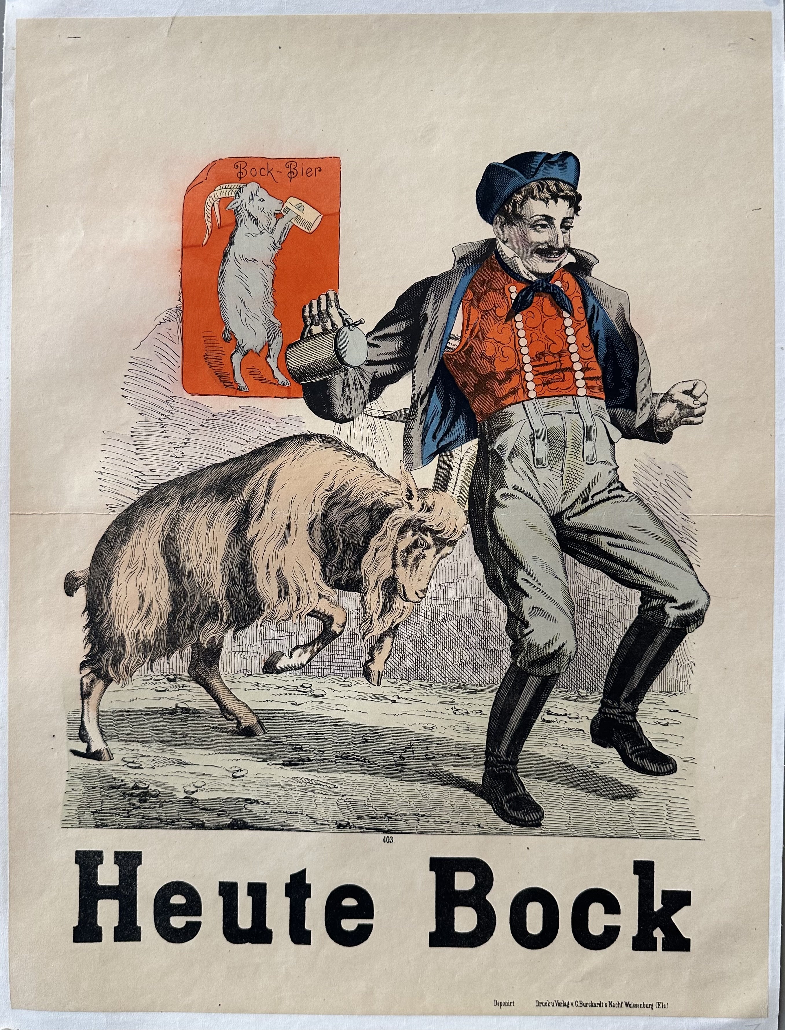 Advertising poster from German beer brand Bock-Bier featuring a man being rammed by a goat.