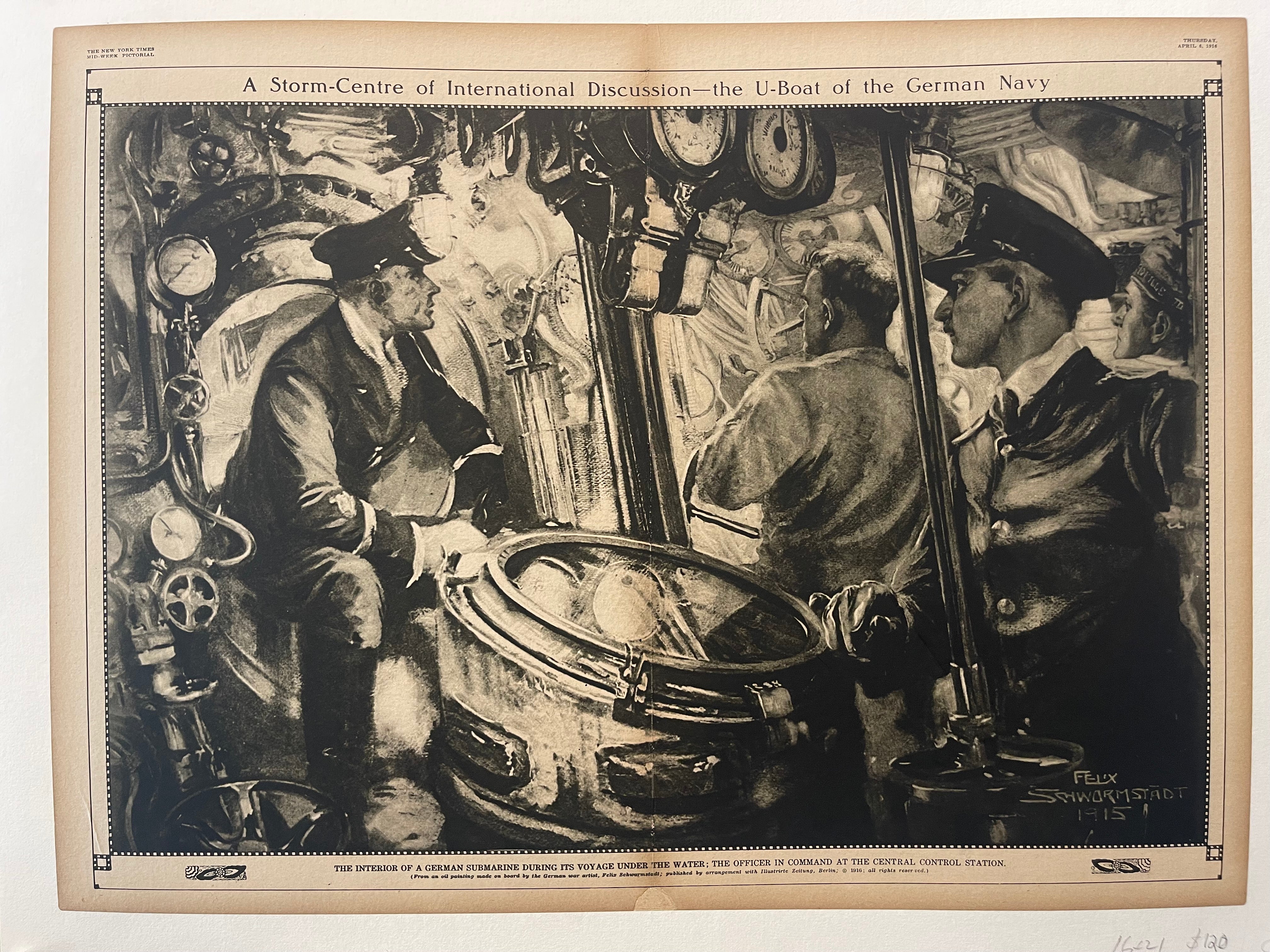This piece printed by the NY Times Mid-Week Pictorial depicts the interior of a German U-Boat. The reference was given by a German artist who signed his name on the bottom right of the original painting.