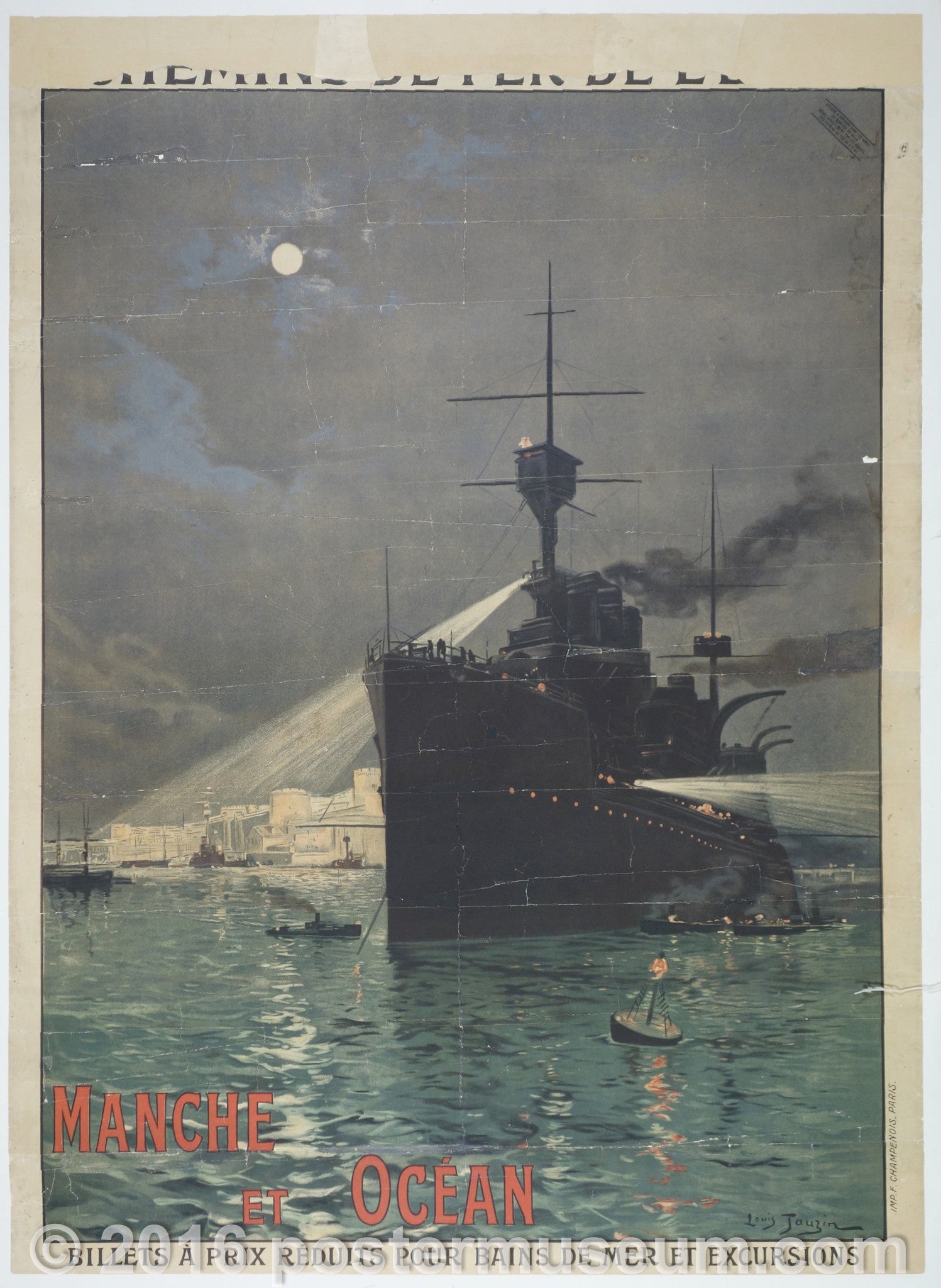 This vintage French poster is part of a series of posters advertising the possible travel locations reachable by France's state railways. This poster in particular highlights the attraction of the Manche region of France, which borders the ocean and the English Channel. Illustrated on the poster is a breathtaking view of a ship navigating through the water in the dead of night, only the full moon and its own searchlights interrupting the shadow of the grey sky.