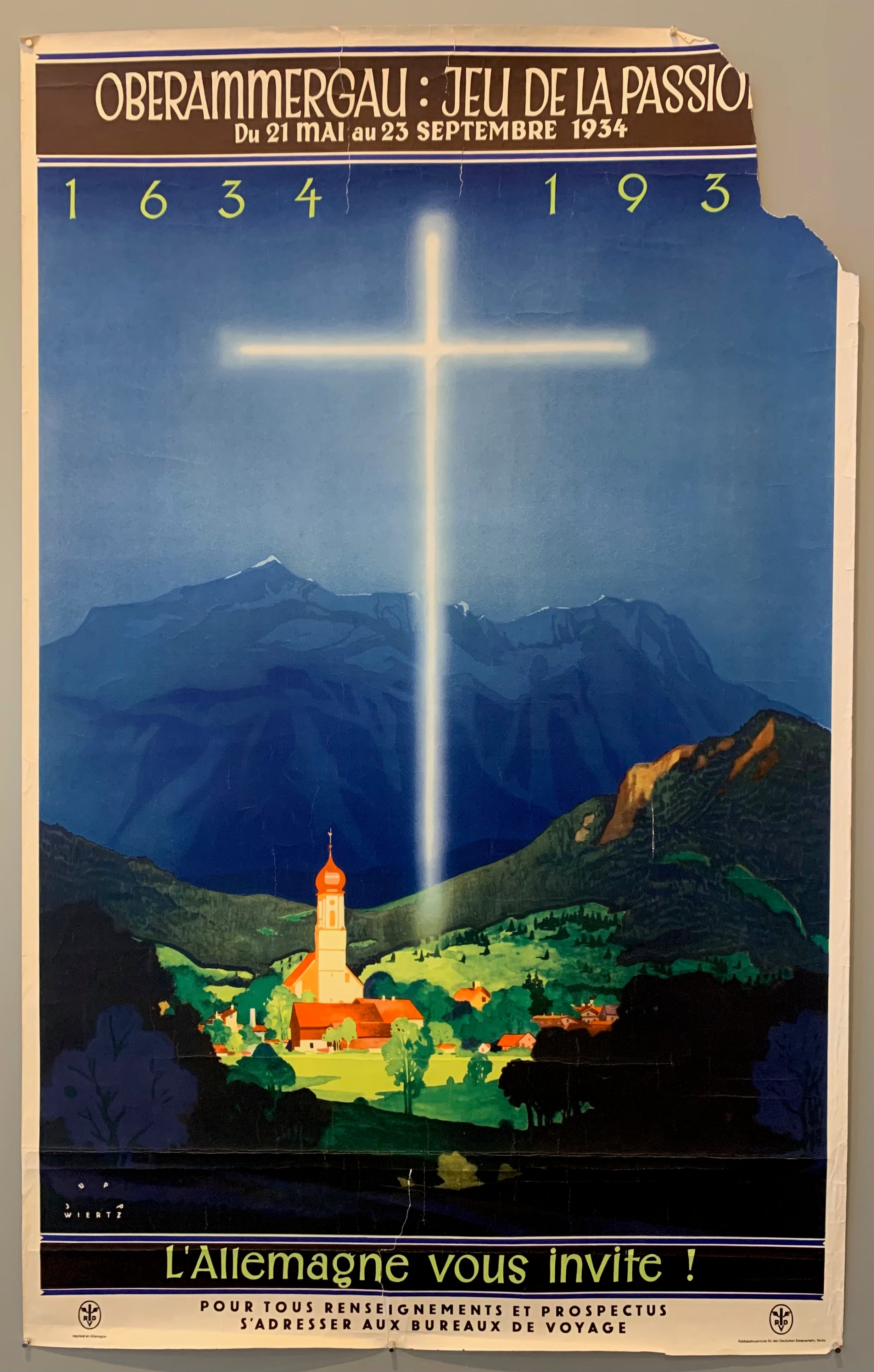 German poster in French for the Oberammergau Passion play. The Oberammergau Passion Play is a passion play that has been performed every 10 years since 1634 by the inhabitants of the village of Oberammergau, Bavaria, Germany. Artist Jupp Wiertz was born in Aachen in 1888 and studied in Berlin and Leipzig. He later went on to work on publicity for the German Reichsbahn, Zeppelin production art designs, and for Lufthansa.