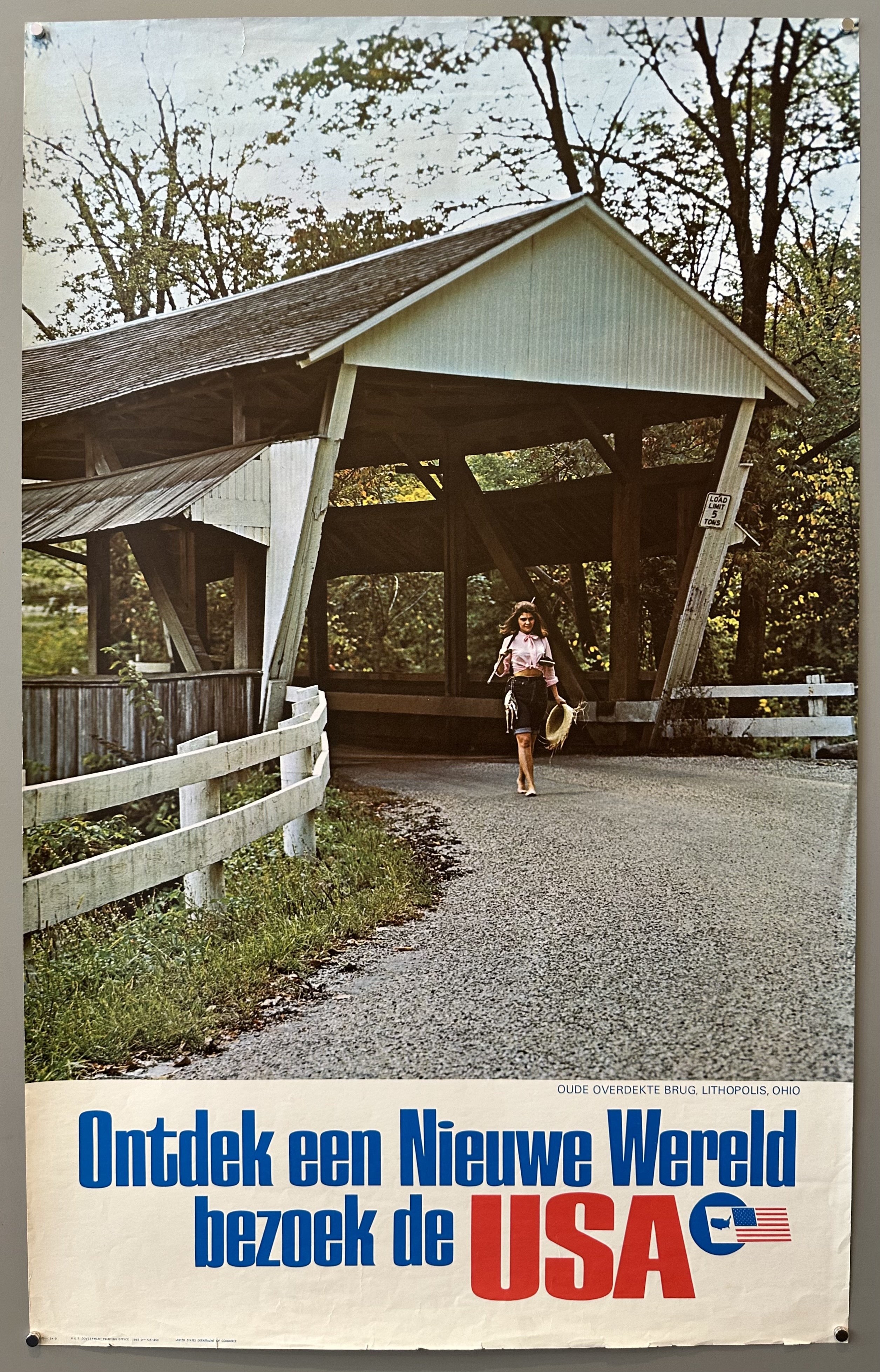 Travel poster aimed at a Dutch audience, this all-American girl walks barefoot through lush foliage, a straw hat in hand. Published by the United States Department of Commerce.