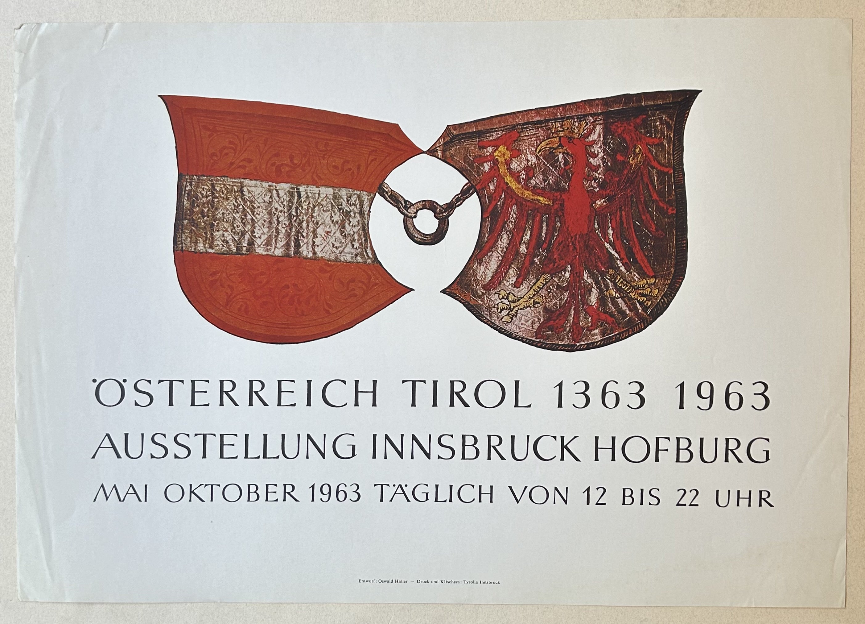 This poster reads "Osterreich," the German word for Austria, and then "Tirol," which refers to the Federal state of Tyrol in Western Austria. The second line includes the word "Ausstellung," which means "exhibition"; Innsbruck and Hofburg are both Austrian cities. The third line shares dates and times of the exhibition.