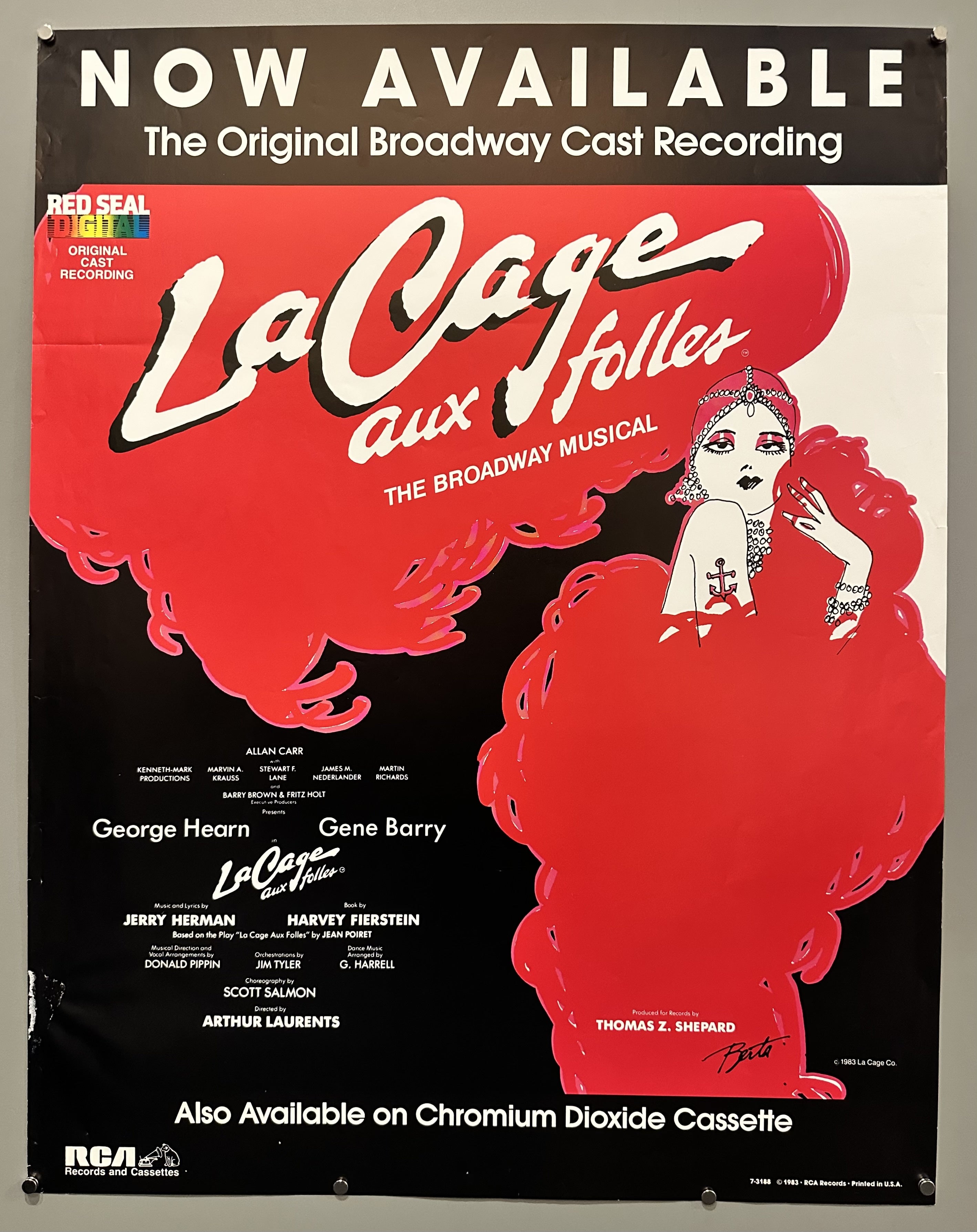Broadway musical cast recording of "La Cage aux Folles". The poster advertises that the album, which features music and lyrics by Jerry Herman and stars George Hearn and Gene Barry.