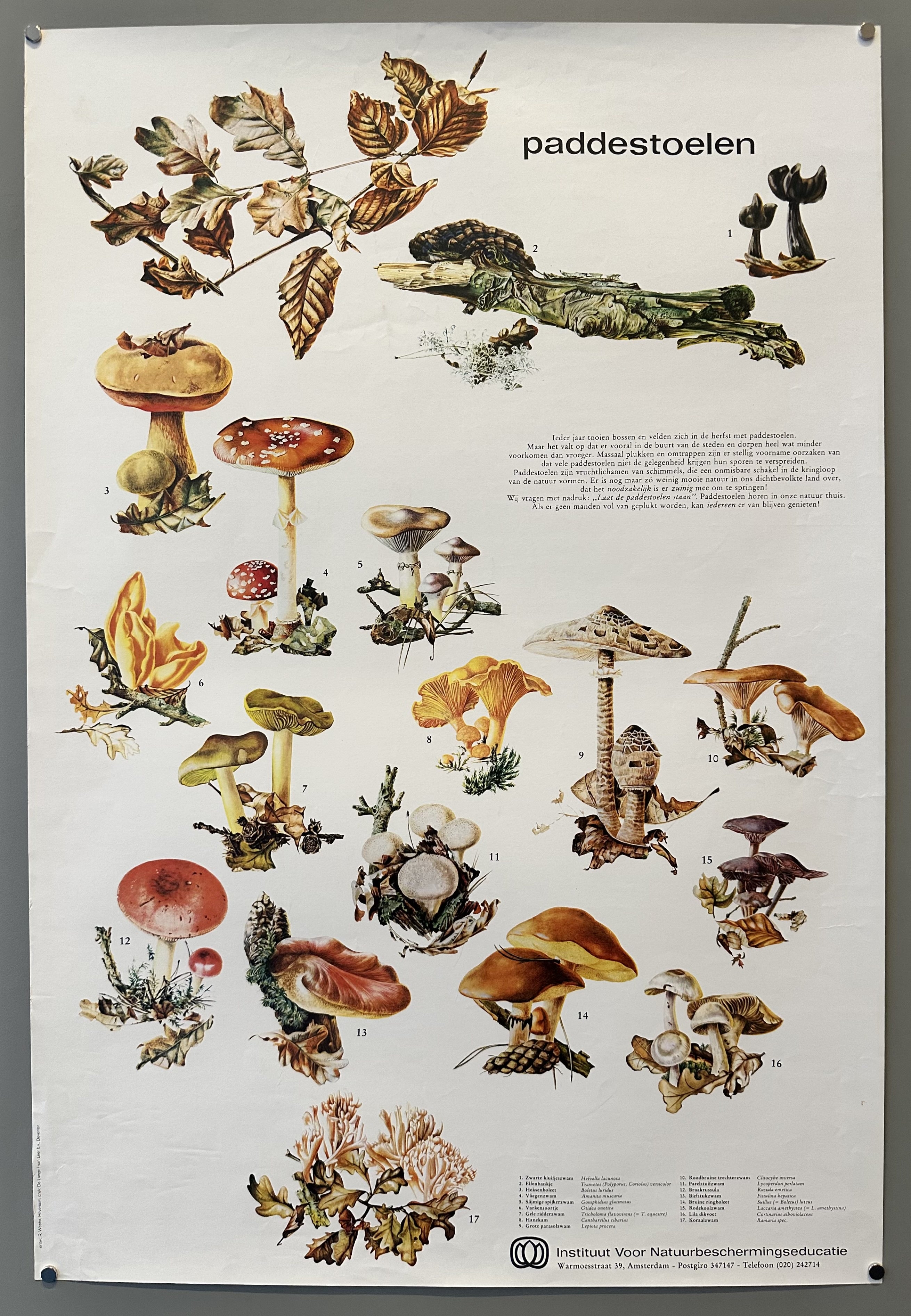 Educational poster of mushrooms featuring 17 detailed illustrations of different varieties, including gilled species, boletes, and coral fungi. Each illustration is numbered to correspond with a legend at the bottom of the page.