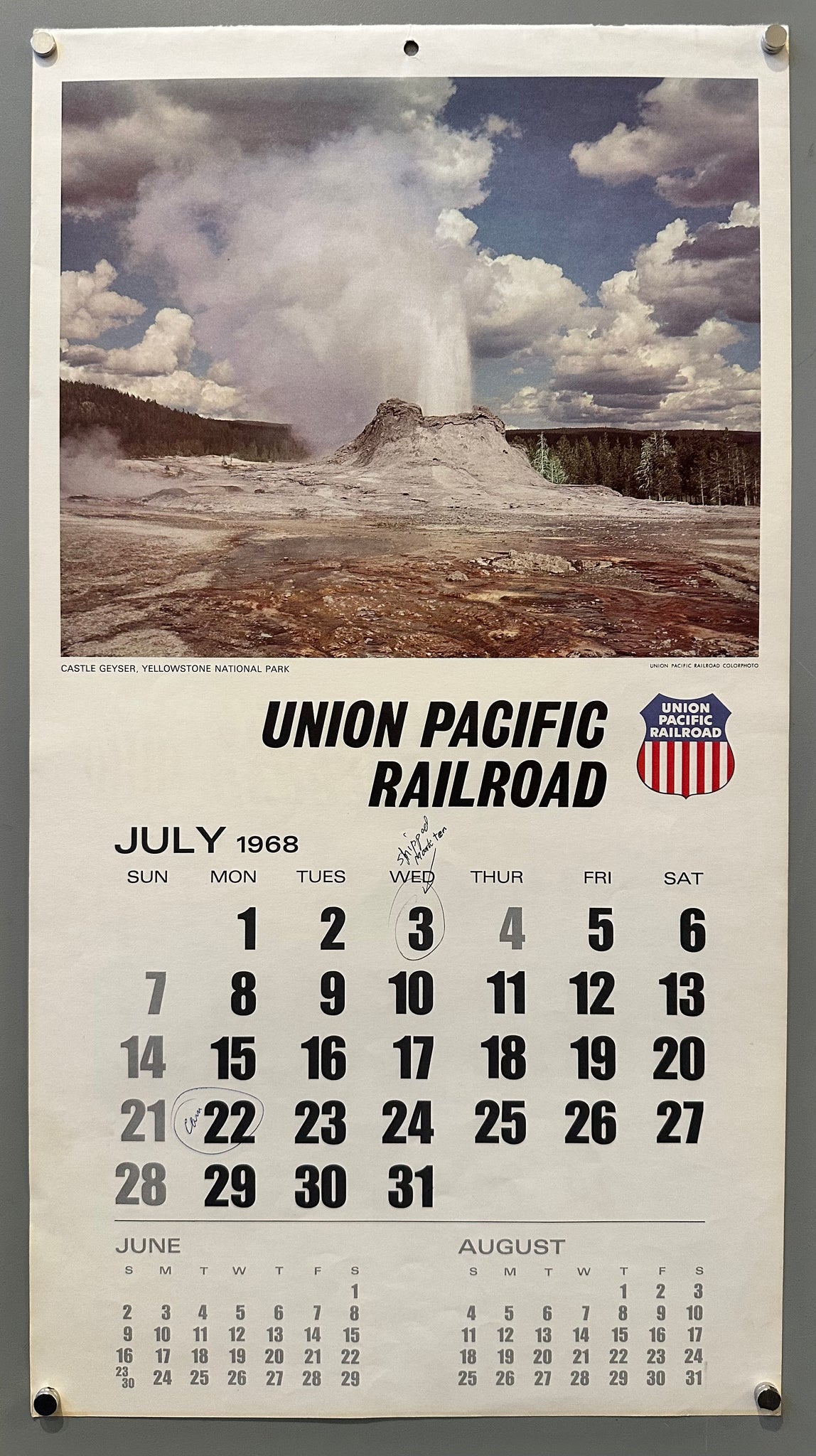 A double-sided calendar from Union Pacific Railroad with a photograph of Castle Geyser erupting in Yellowstone National Park on the back for the month of July.