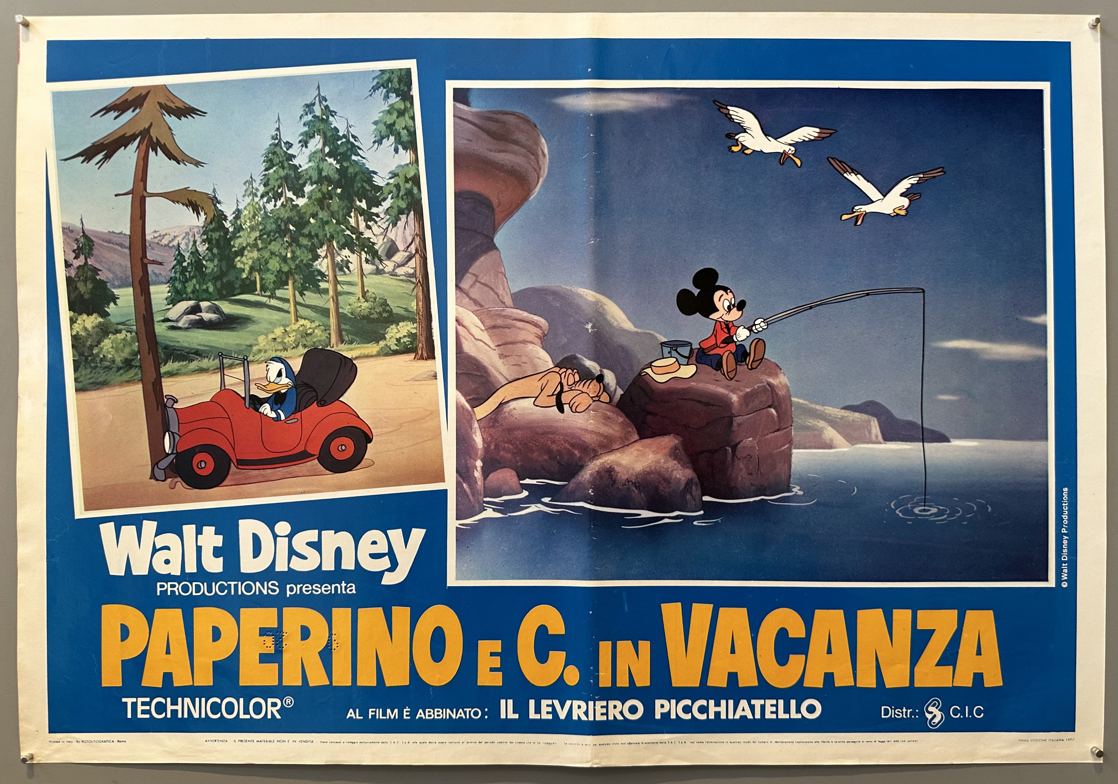 This adorable print shows scenes from the Italian version of the Walt Disney cartoon about Donald Duck, Goofy, and Pluto and their adventures on vacation.