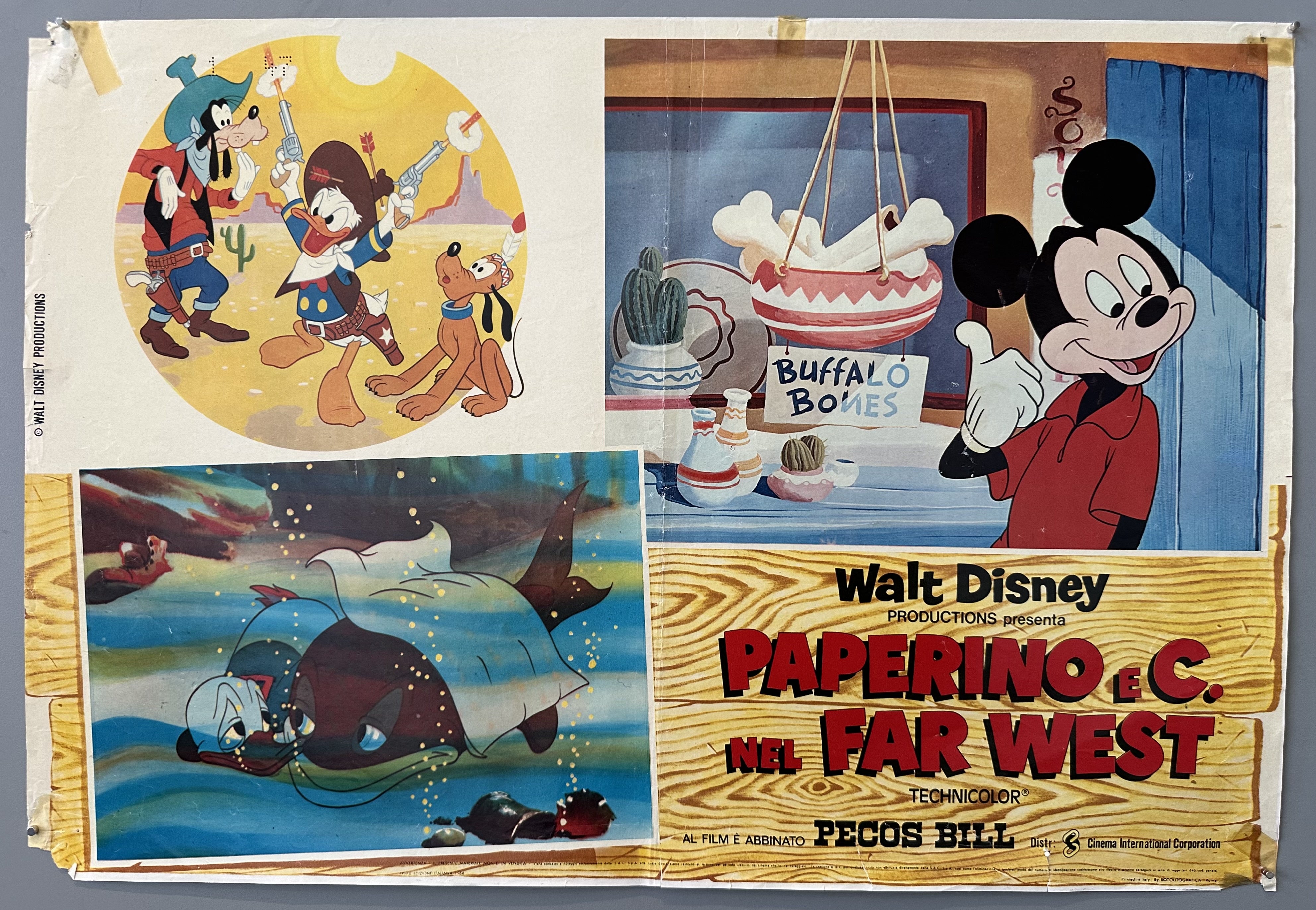 This adorable print shows scenes from the Italian version of the Walt Disney cartoon about Donald Duck, Goofy, and Pluto and their adventures in the wast. Saloons, outlaws, cacti and more!