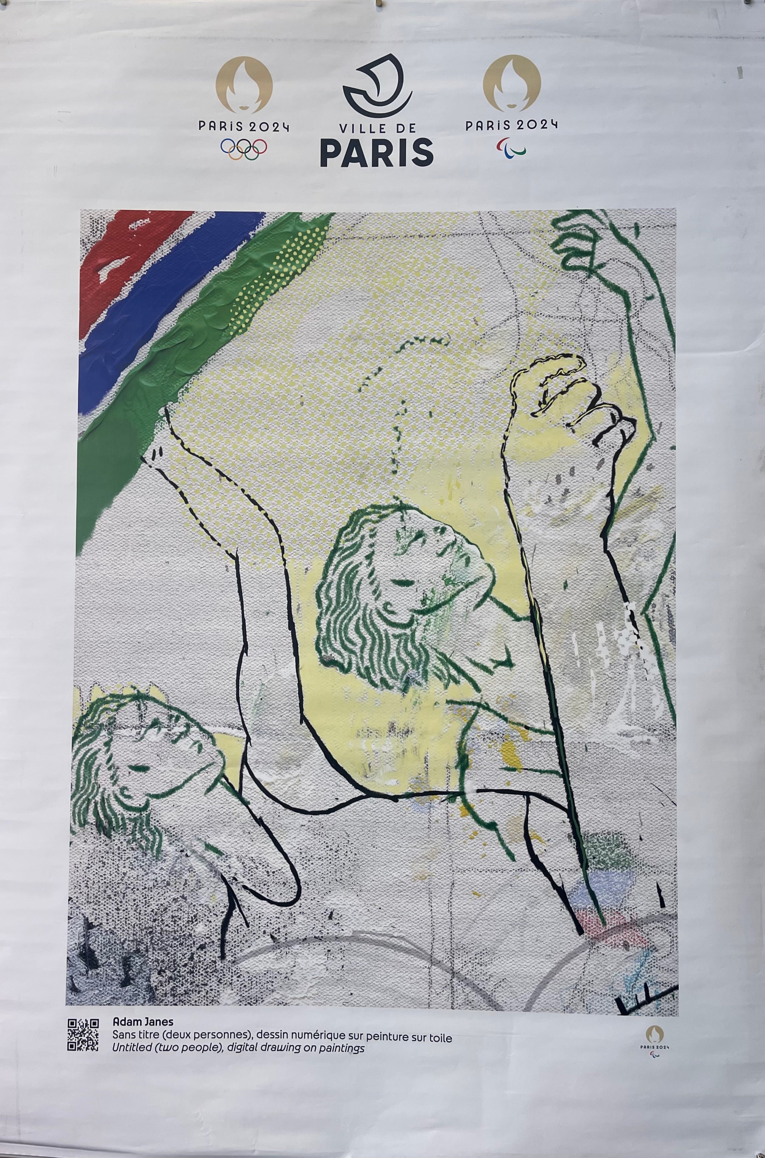 Poster for the Cultural Olympiad, a cultural program for the Paris 2024 Olympics that aims to unite art and sport. Poster features a multimedia painting of two figures reminiscent of ancient Greek and Roman art, with textured stripes in the background.