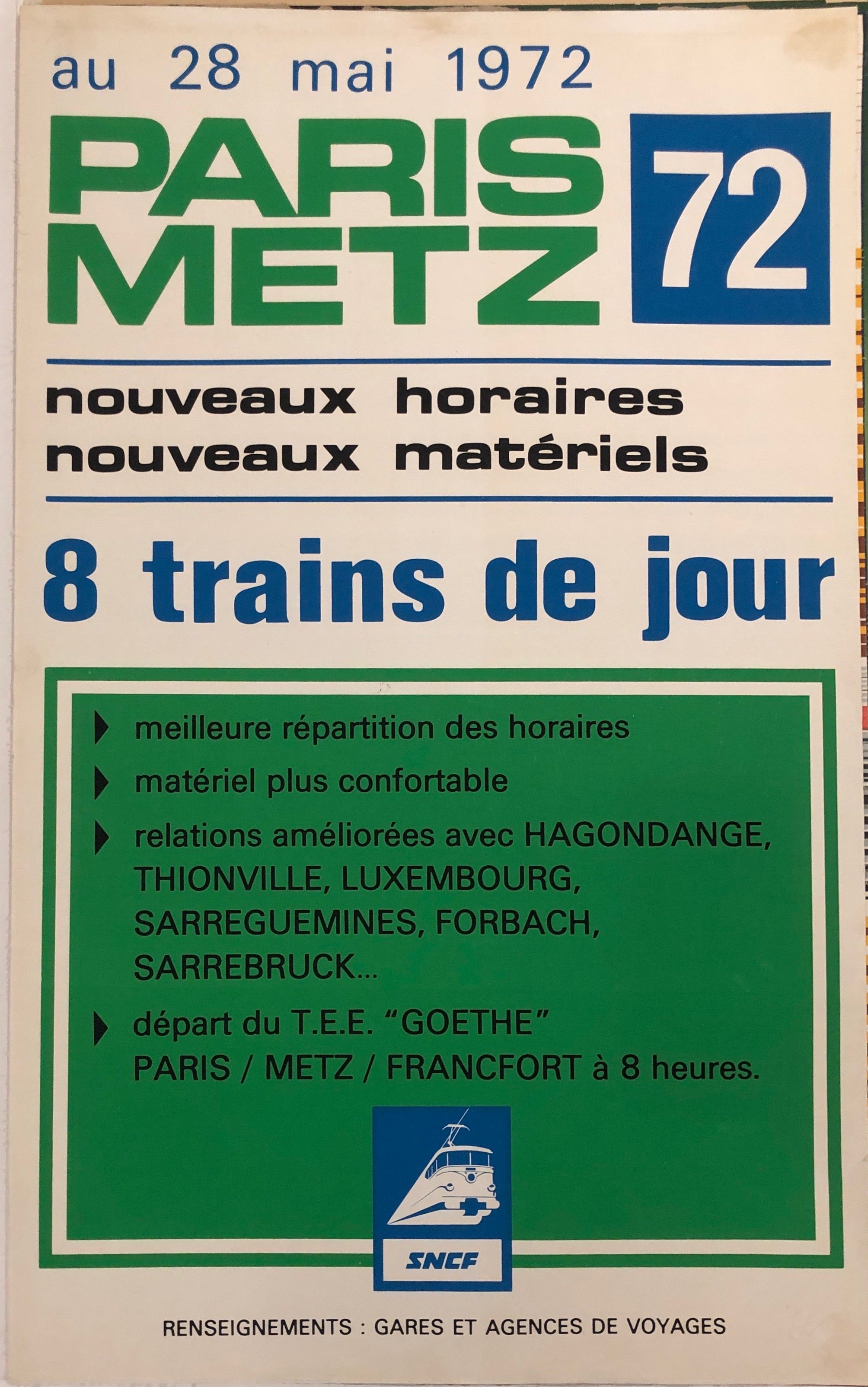 Poster advertising SNCF, the French national rail company. "PARIS METZ 72. new schedules new materials. 8 day trains. Better distribution of hours. More comfortable material. Improved relations with Hagondange, Thionville, Luxembourg, Sarreguemines, Forbach, Saarbrücken. Departure of TEE "Goethe" Paris / Metz / Frankfurt at 8 am".